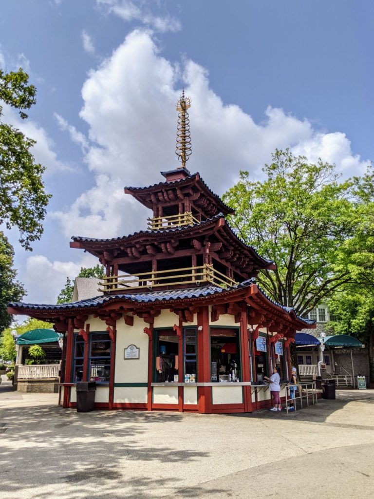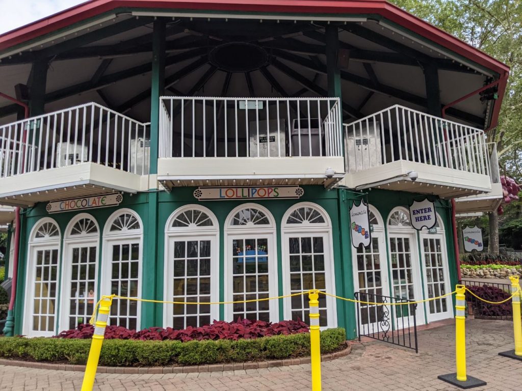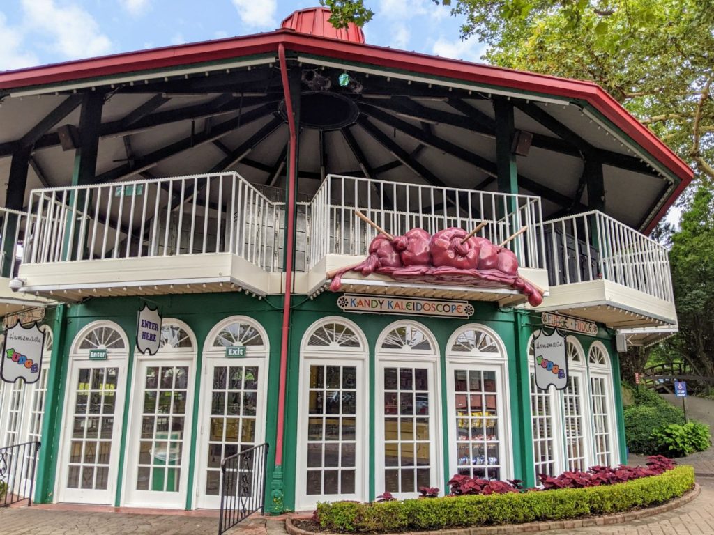 Take note of the architecture of the food stands – Parkside Cafe is charming, and there’s an Asian-style pagoda serving sausages and chicken tenders on one side and ice cream on the other. A pink art deco building serves funnel cakes and corn dogs. An octagonal building at the entrance is a candy and fudge shop. (Careful, it gets absolutely mobbed at the end of the day!)