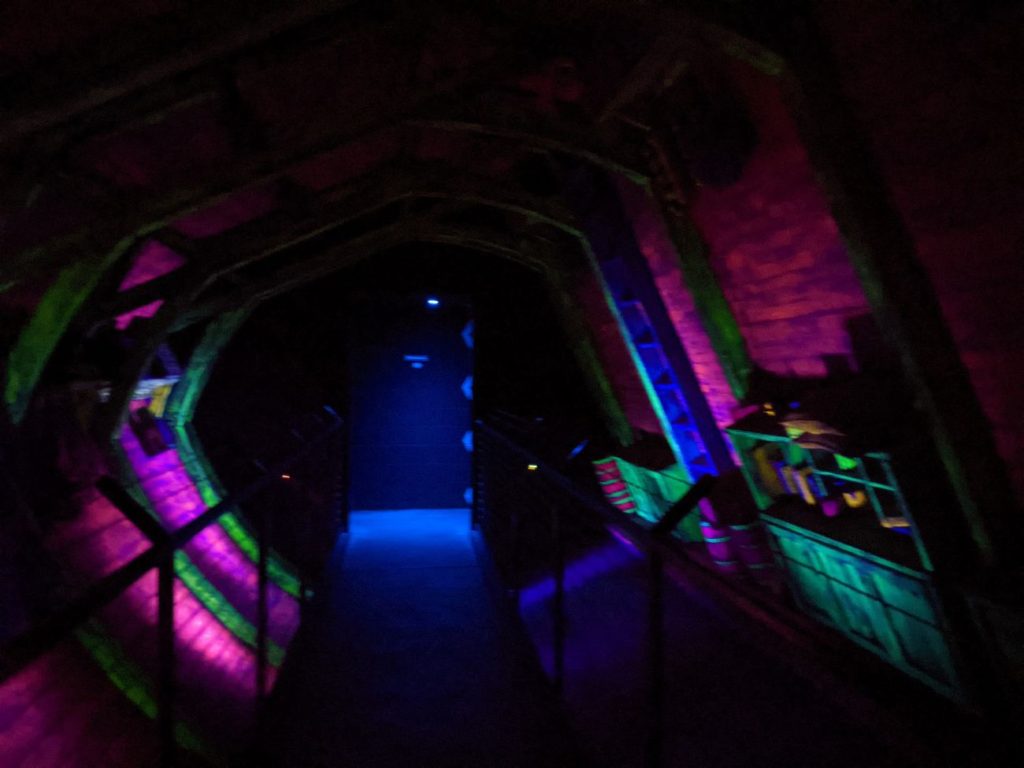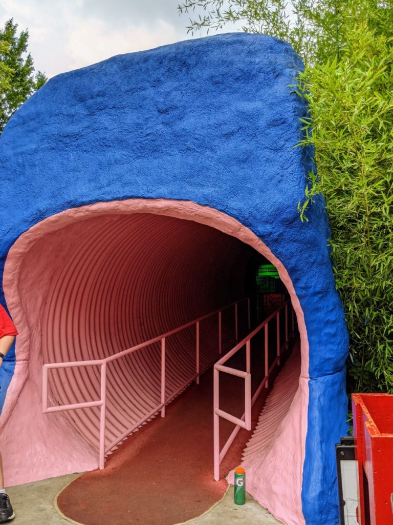 I can’t say that the indoor Exterminator coaster is a terrible ride, but it’s pretty gross in there. First of all, you stand in an outdoor queue, which is pretty shaded and not too bad. Then you’re let into a long tunnel and MORE LINE inside, up a ramp in a crowded room. There’s one side door they keep open, but during Covid, this room really wigged me out. The ride also seemed to break down pretty frequently, so I was stuck in this room for quite a bit.