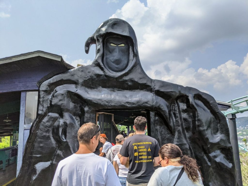 By far, the best roller coaster at Kennywood is Phantom’s Revenge. It even has an interesting line, an elevated walkway above the Lost Kennywood section of the park. Then after passing through the phantom himself (itself?) you’re loaded onto either a purple or green train, up a 160-foot lift hill. The first drop is fun, but the second drop is longer than the first, at 280 feet long and down into the ravine. The speed doesn’t let up and it’s a really great ride! It makes great use of the terrain and weaves in and out of the Thunderbolt track as well. It’s the only coaster in the park I rode twice.