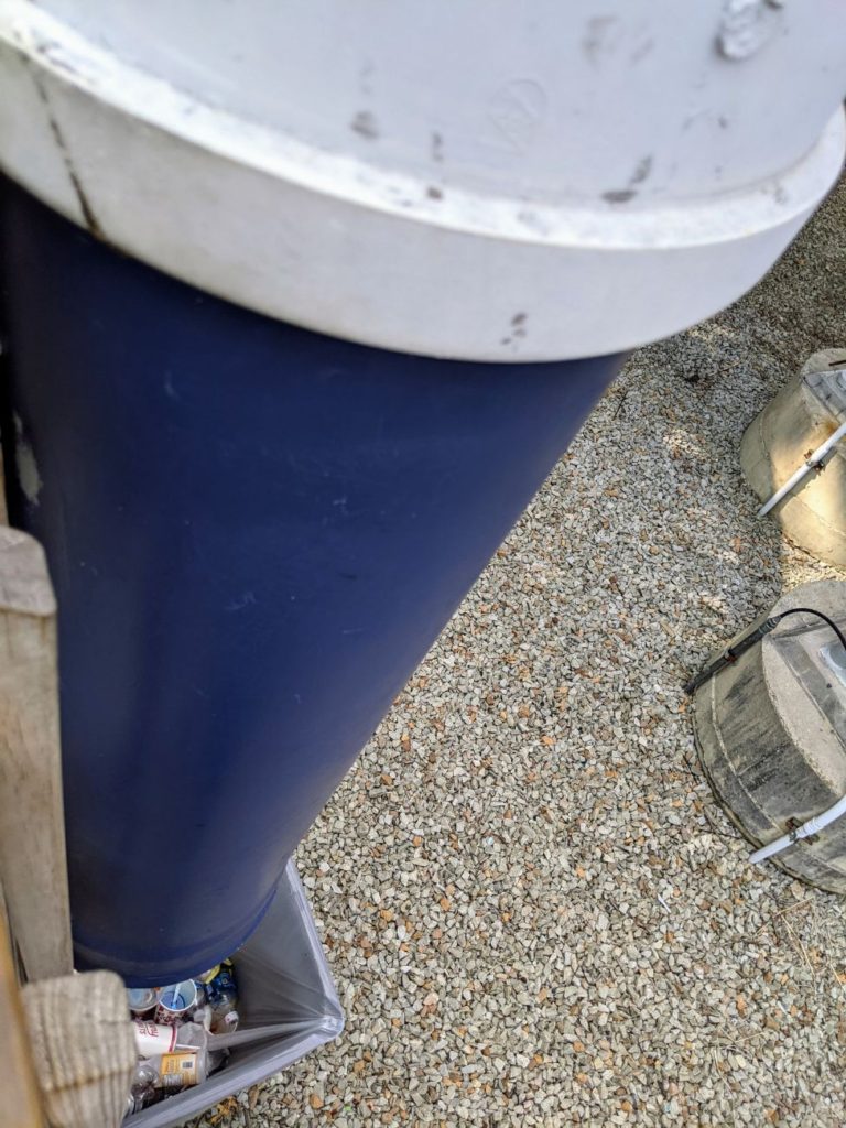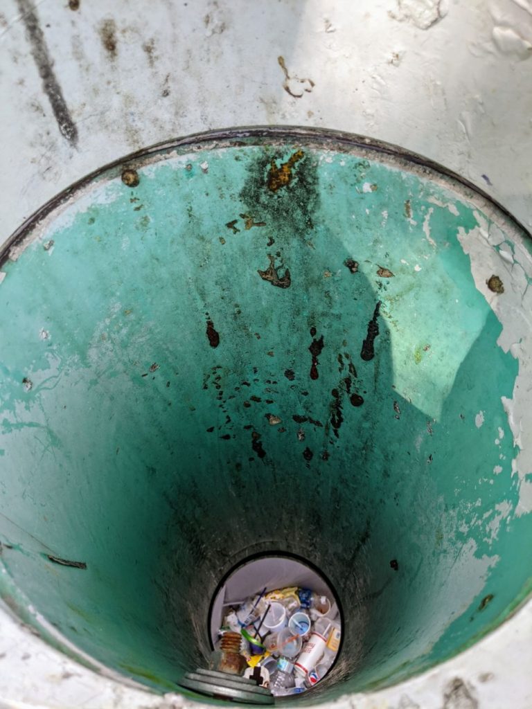 I don’t like that the line is full in the sun, but I was strangely taken by the garbage “tubes.” Along an elevated section of the line, there are garbage cans down on the ground with huge PVC tubes leading from the line down to the can. This is some creative, common-sense problem-solving right there. Bravo!