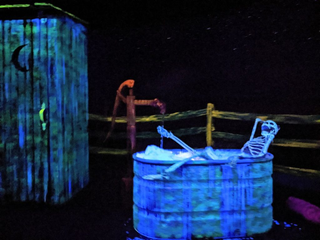 I also really enjoyed the Old Mill, the oldest ride at Kennywood, built originally in 1901. It’s a haunted western silent movie dark ride, where you ride a boxy boat past several show scenes depicting a skeleton’s hapless adventure with a skunk sidekick.