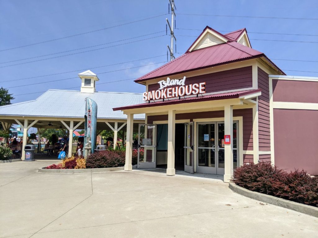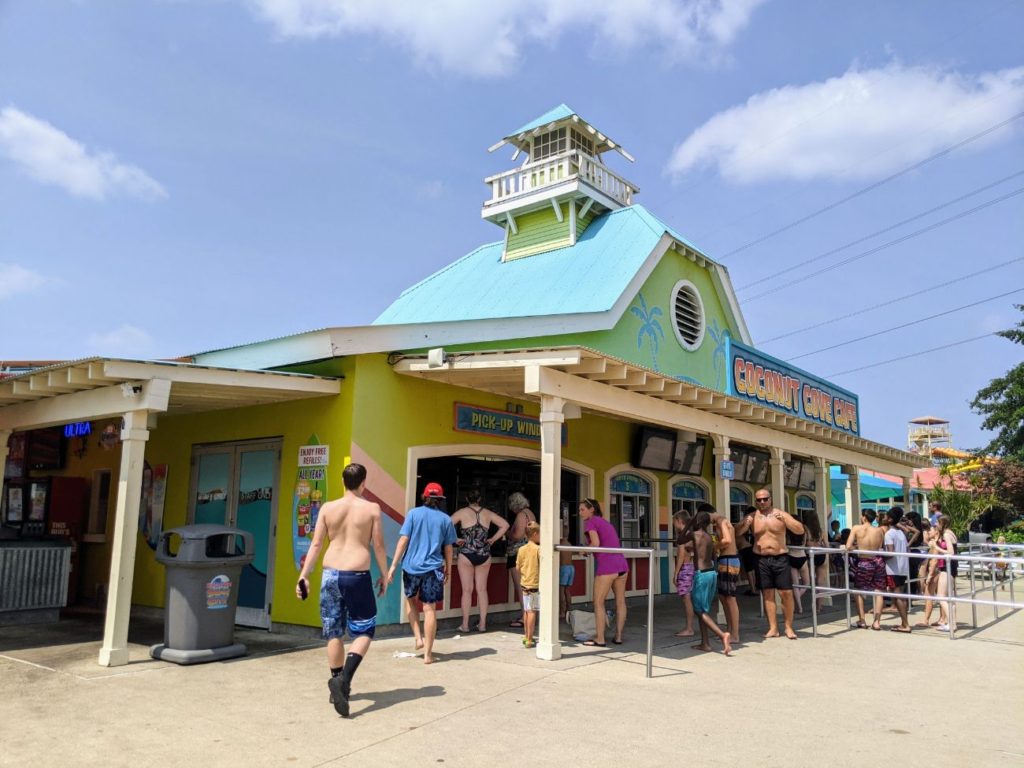 There are two spots to eat in Soak City. Coconut Cove Cafe has pizza, burgers, and chicken fingers. The Island Smokehouse has pulled pork, chicken wings, and grilled shrimp. There’s also a bar and a smoothie stand.