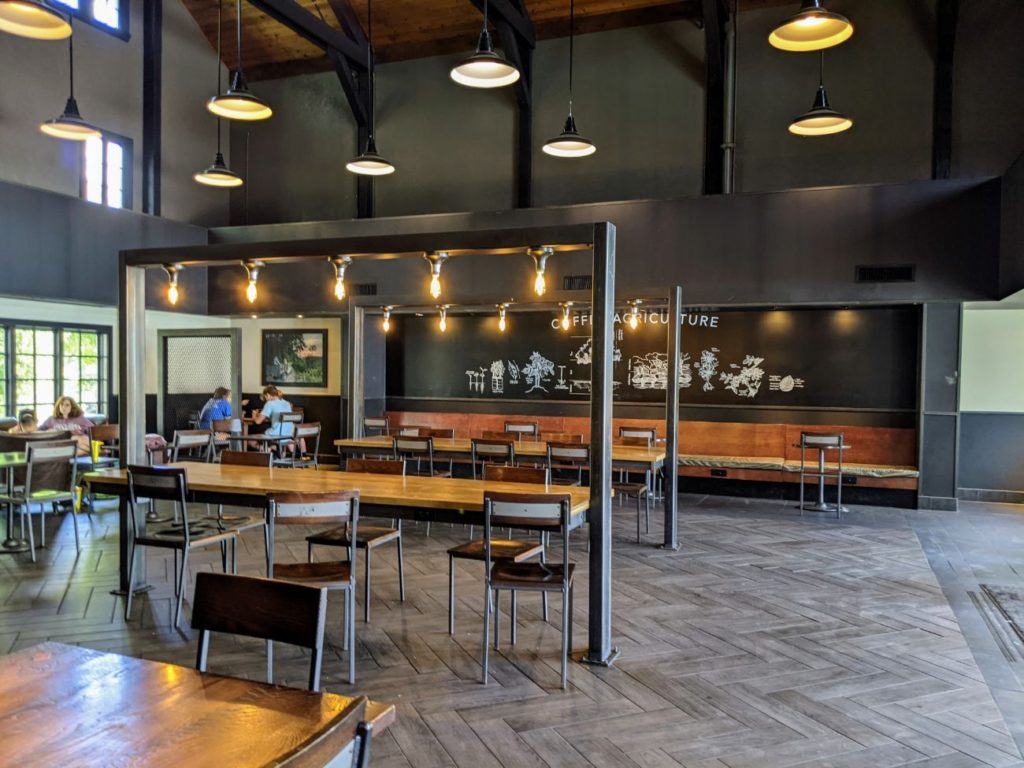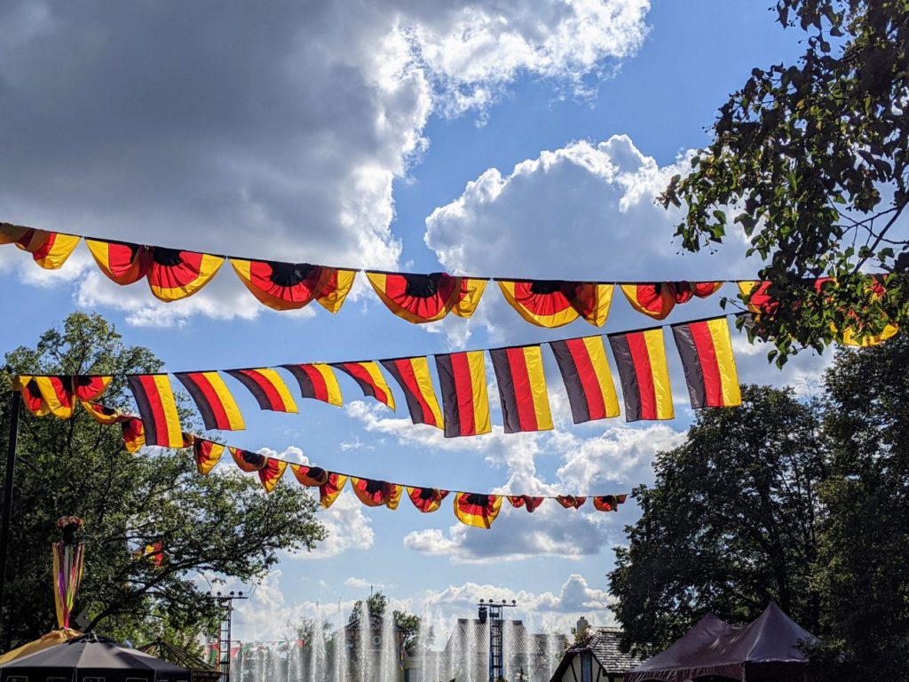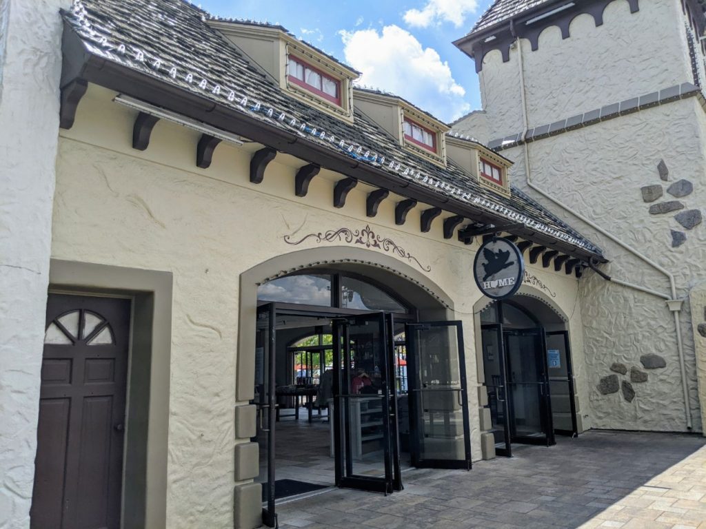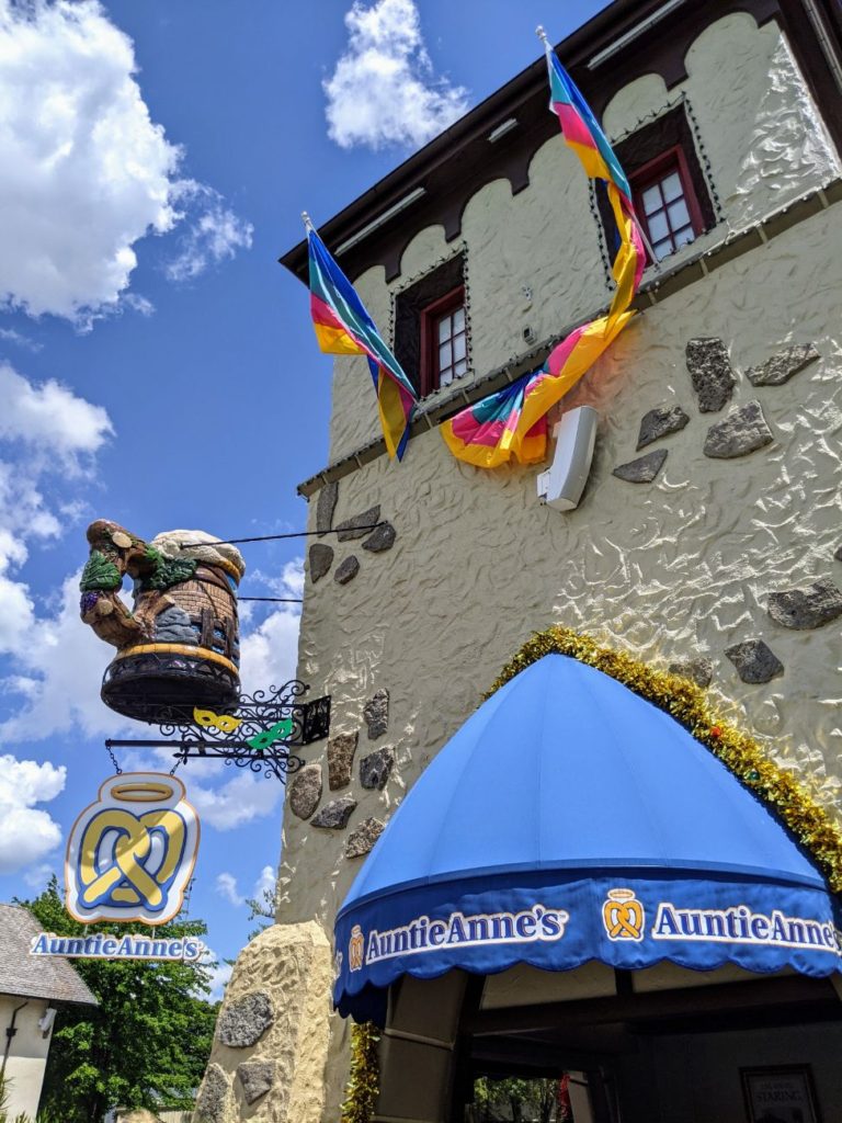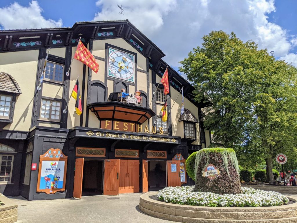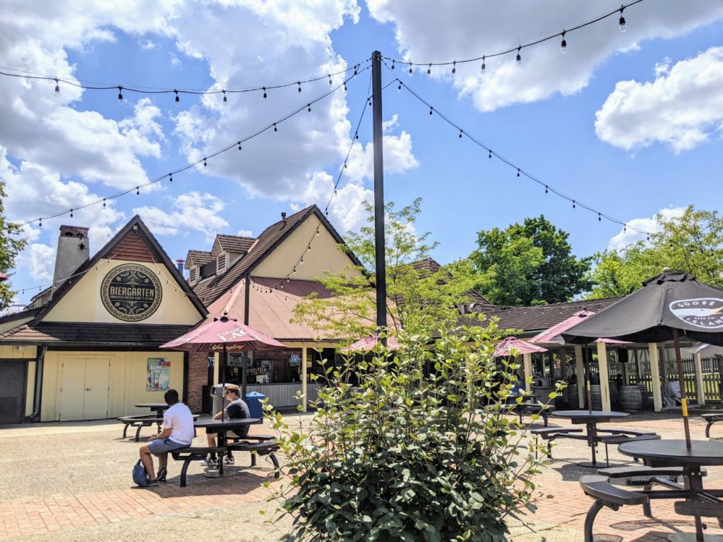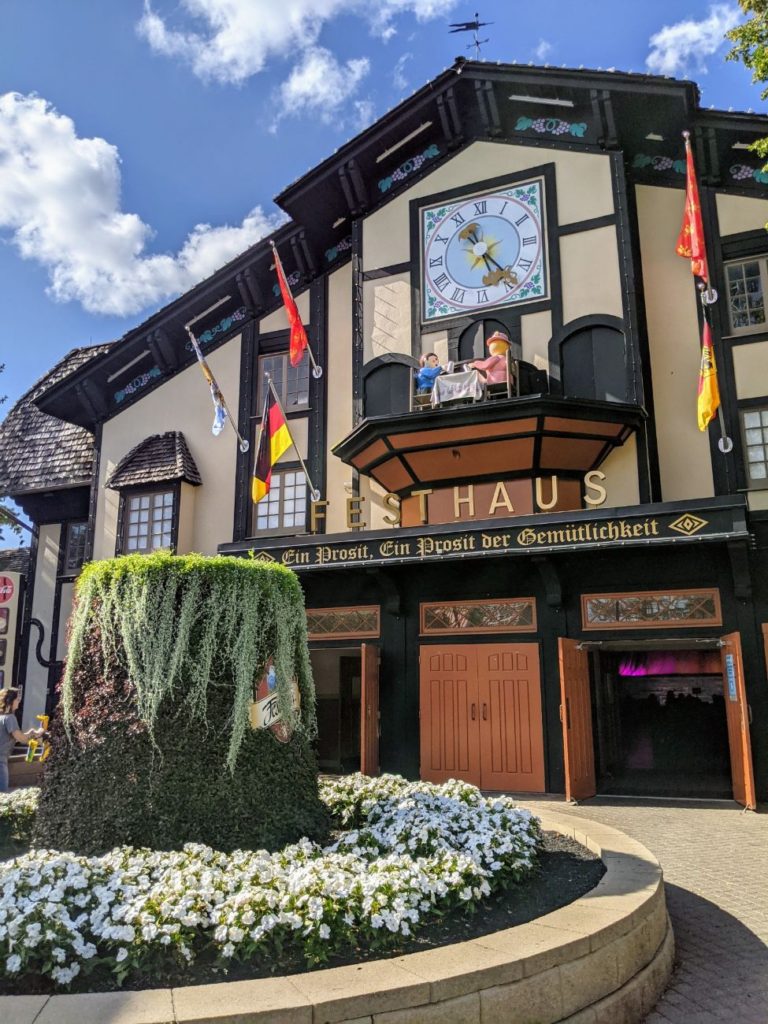 The area immediately around the large German-style Festhaus dining hall is called Oktoberfest. Inside the large, air-conditioned Festhaus, you find standard theme park fare like burgers, pizza, and chicken fingers. They also serve vegan burgers and salads. The other side of the hall features a Panda Express, plus there’s a Bier Garten with alcoholic drinks. There’s also a stage, so I imagine during non-Covid times, there is at least sometimes live entertainment.