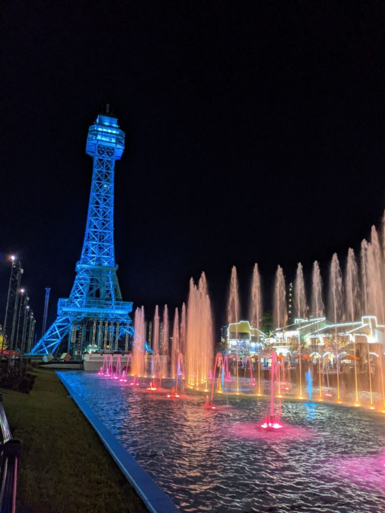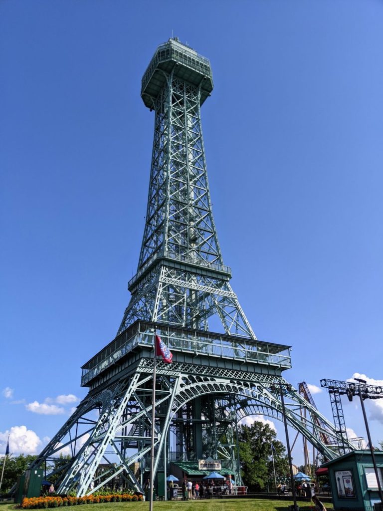Kings Island is (now) another Cedar Fair park, like Cedar Point. It’s a particularly beautiful park, with stunning International Street at the entrance, a huge street-length fountain, and a 314-foot scale replica of the Eiffel Tower at the hub. As for thrills, Kings Island has ’em – big and bigger. If I were to rank Kings Island among the parks I’ve been to this summer, I’d put it way above Carowinds and just below Cedar Point.