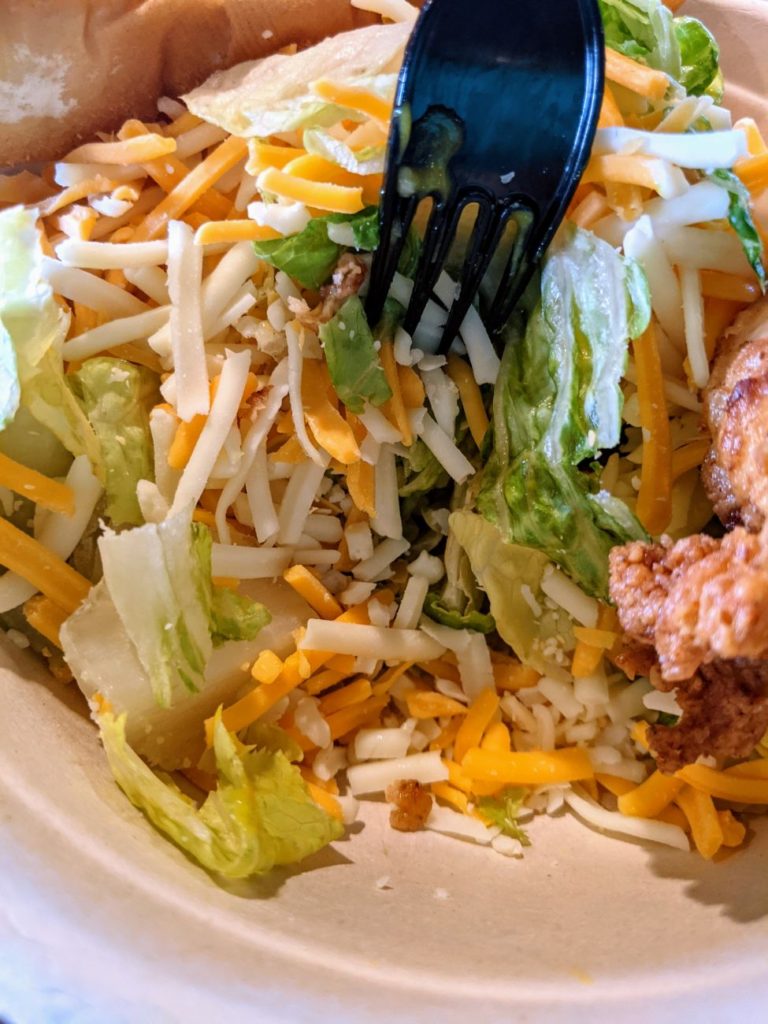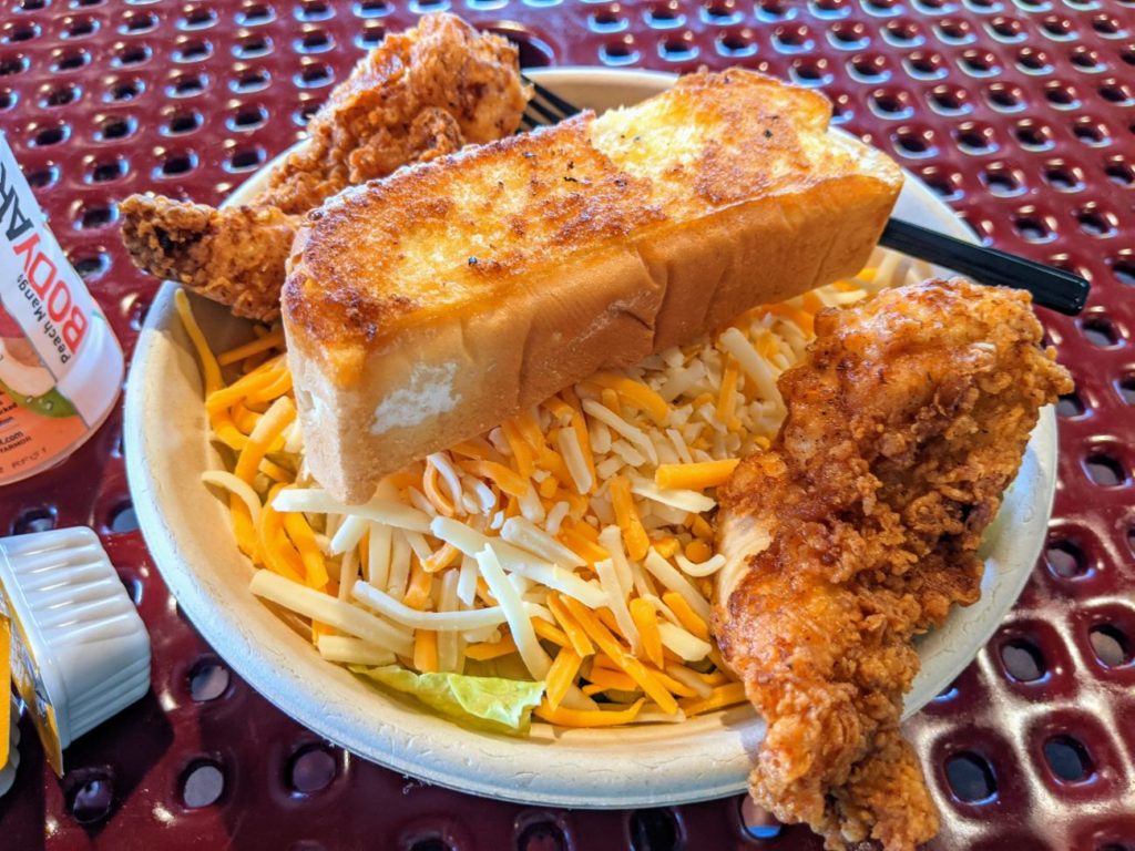 Later, I tried a chicken salad from the Chicken Shack near Banshee. My “salad” turned out to be 75% cheese. It was a shredded cheese and lettuce mix, heavy on the cheese, with another full half-cup of cheese on top, plus two fat chicken fingers and a wedge of toast. I ended up eating just the chicken fingers and toast and leaving the “salad” alone.