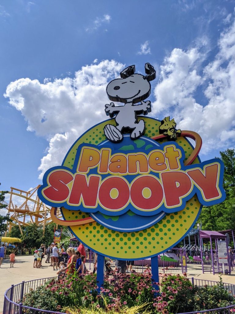 Completing our circle lands us in Planet Snoopy, the colorful kid’s area for Kings Island. The bigger family thrills come with the Race For Your Life Charlie Brown log flume, Flying Ace Aerial Chase kid’s suspended coaster, Surf Dog skate coaster, the classic Woodstock Express wooden kid’s coaster, and The Great Pumpkin Coaster. A kid-sized carousel, bumper cars, train, swings, car ride, gliders, drop ride, and five other in-a-circle rides round out the land with a fun slow-moving Woodstock Whirlybirds helicopter ride on an elevated track above it all.