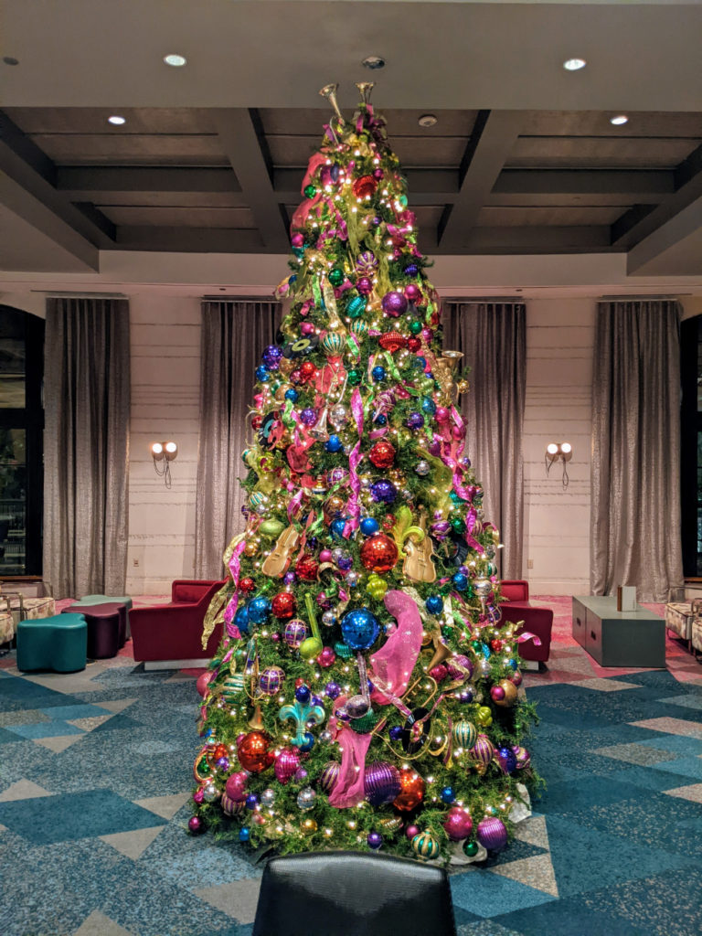 My last stop of the night took me through the Frech Quarter section of the Port Orleans Resort. (Y’all, if I catch Covid, it was from a crowded Disney bus.) Here there are two Christmas trees in the glass lobby of the resort. Predictably, these are festooned with all sorts of mardi gras-style ornaments like beads, masks, sprays, and fleur-de-lis galore. Both trees are topped off with a grand top hat.