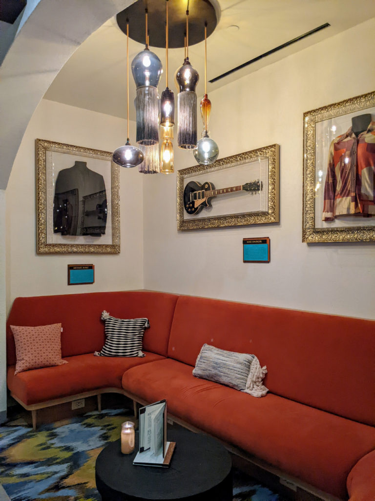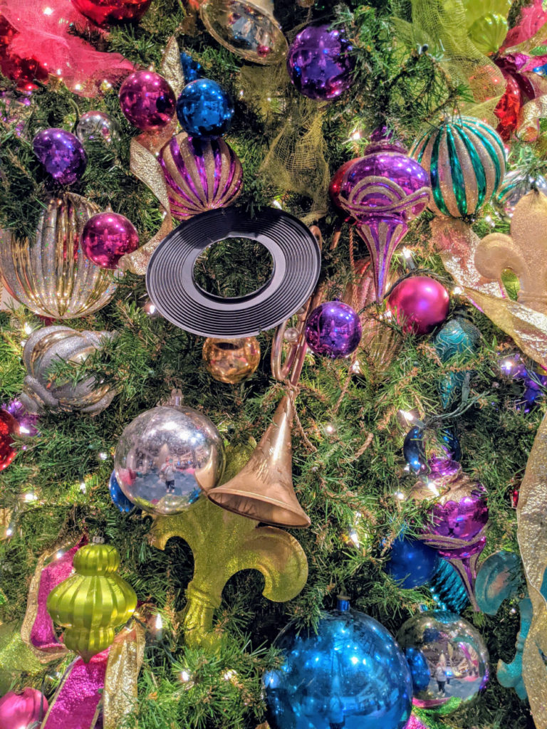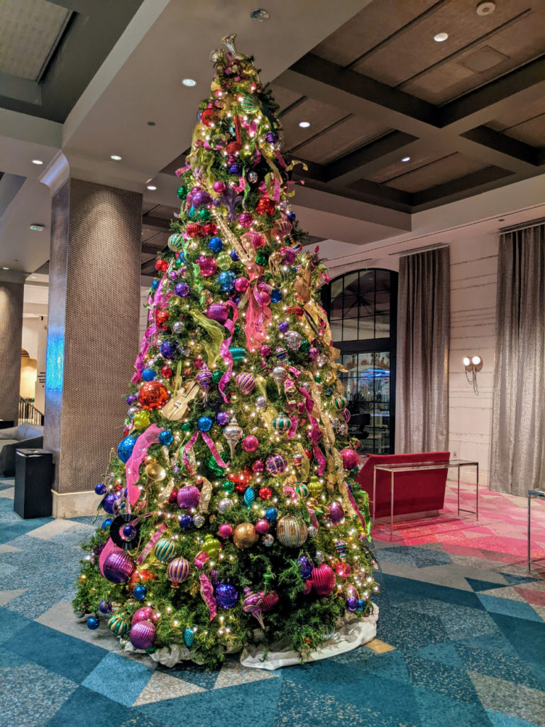 Our first tree is in Hard Rock Hotel. This one has the most theming of any of the Universal trees with a few musical instruments and records as ornaments. But mostly, it is a color scheme that fits within the clubby atmosphere of the hotel.