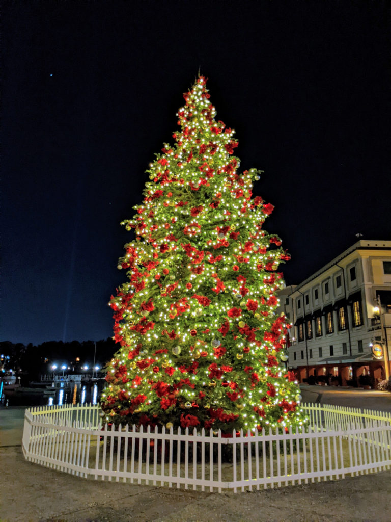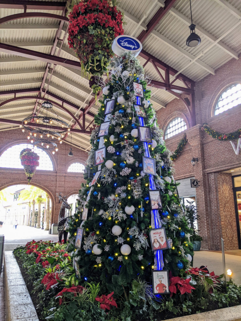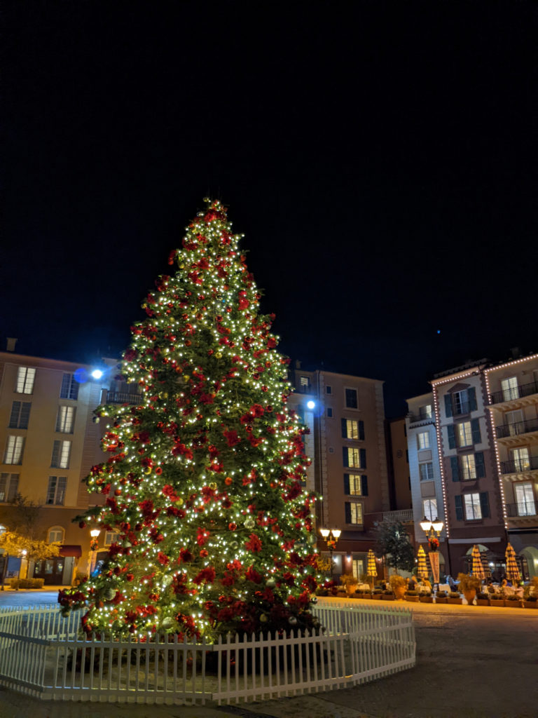 At Portofino Bay, there is a huge LIVE tree in the spacious bay area of this Italian village-themed hotel. It’s decorated with white lights, red poinsettias, and classic round ornaments in silver and gold.
