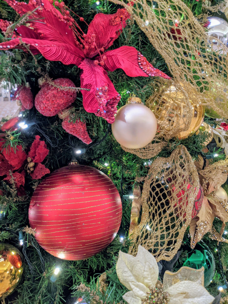 Inside the hotel, there’s a smaller (fake) tree in the check-in lobby, this one decorated in reds, greens, white, and gold.