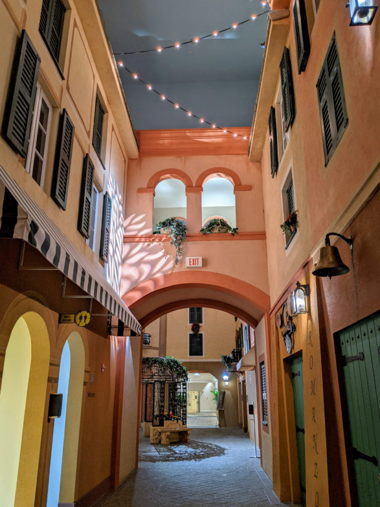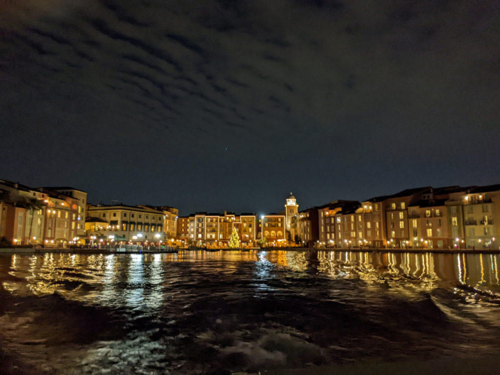First of all, parking at Universal’s City Walk is free after 6 pm, so I recommend starting there. My method of attack is to walk from City Walk to the resort hotels on either side, then take the complimentary boat ride back. For instance, if you walk toward Universal Studios, there’s a small path just to the right of the park entrance. (There’s a security checkpoint where the path starts.) Walk down this and you come first to the Hard Rock Hotel, then at the end, the beautiful Portofino Bay Resort. From Portofino Bay, you can take complimentary boat transportation back to City Walk.