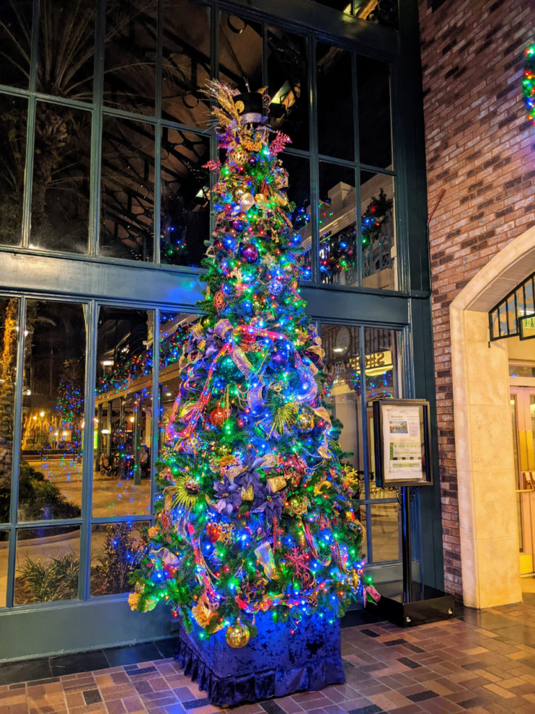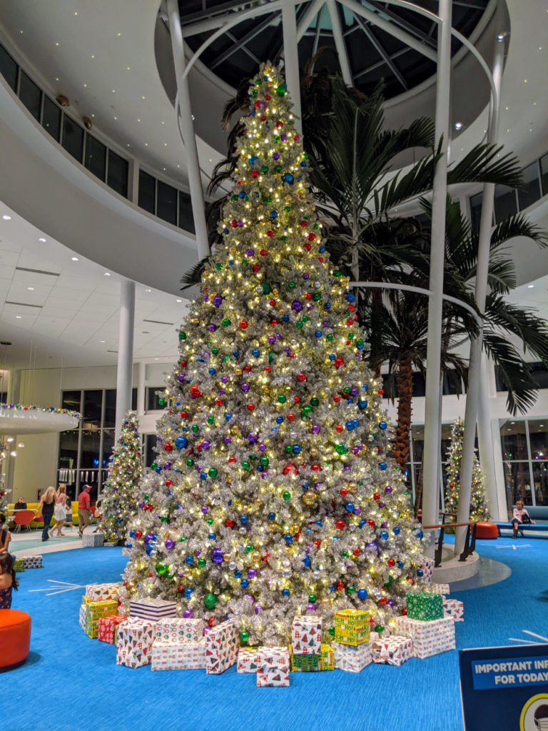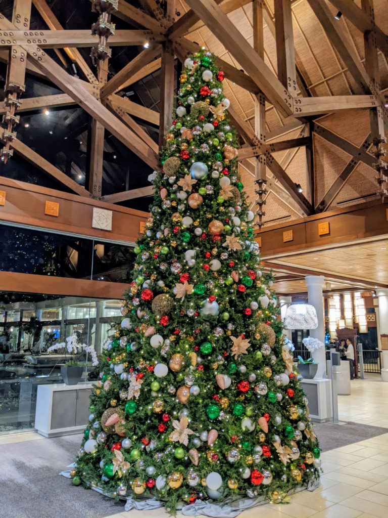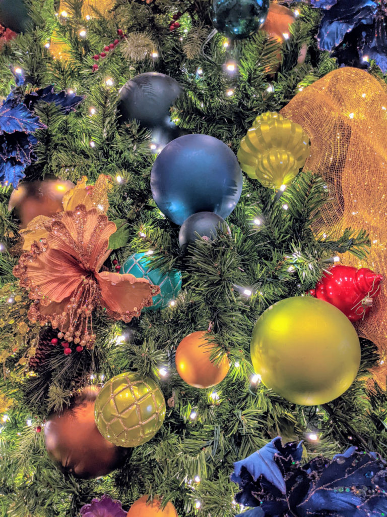 At the Asian-themed Royal Pacific Resort, the tree is adorned in red, green, gold, and silver. There’s nothing even remotely thematic about this one.