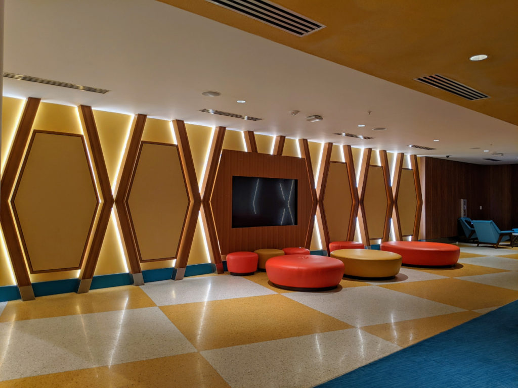 At the retro-styled Cabana Bay Beach Resort is a nice big silver tree with simple red, blue, green, purple, and gold ornaments. Even though it’s simple, it’s at least in keeping with the theme of the resort.