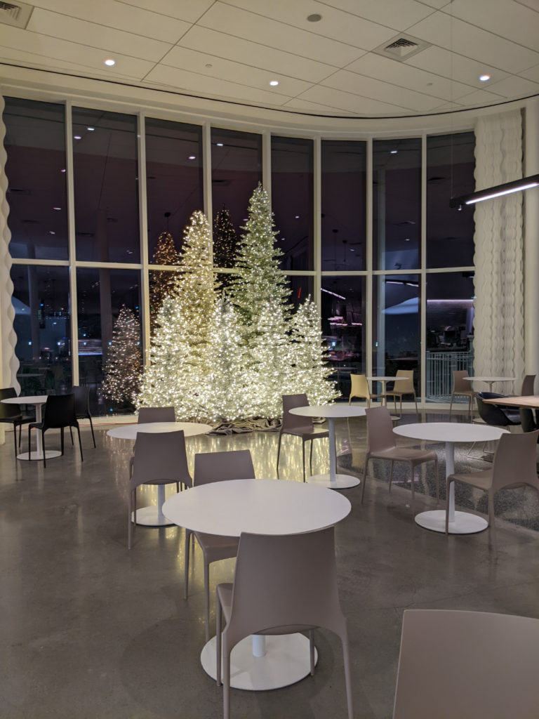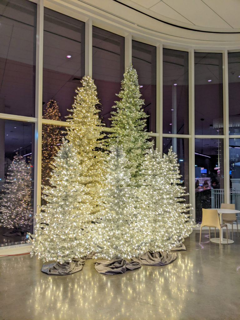 The ultra-modern style of the Aventura Hotel calls for a similarly stark Christmas representation. Here, they wrap groups of silver trees in white lights and call it a day.