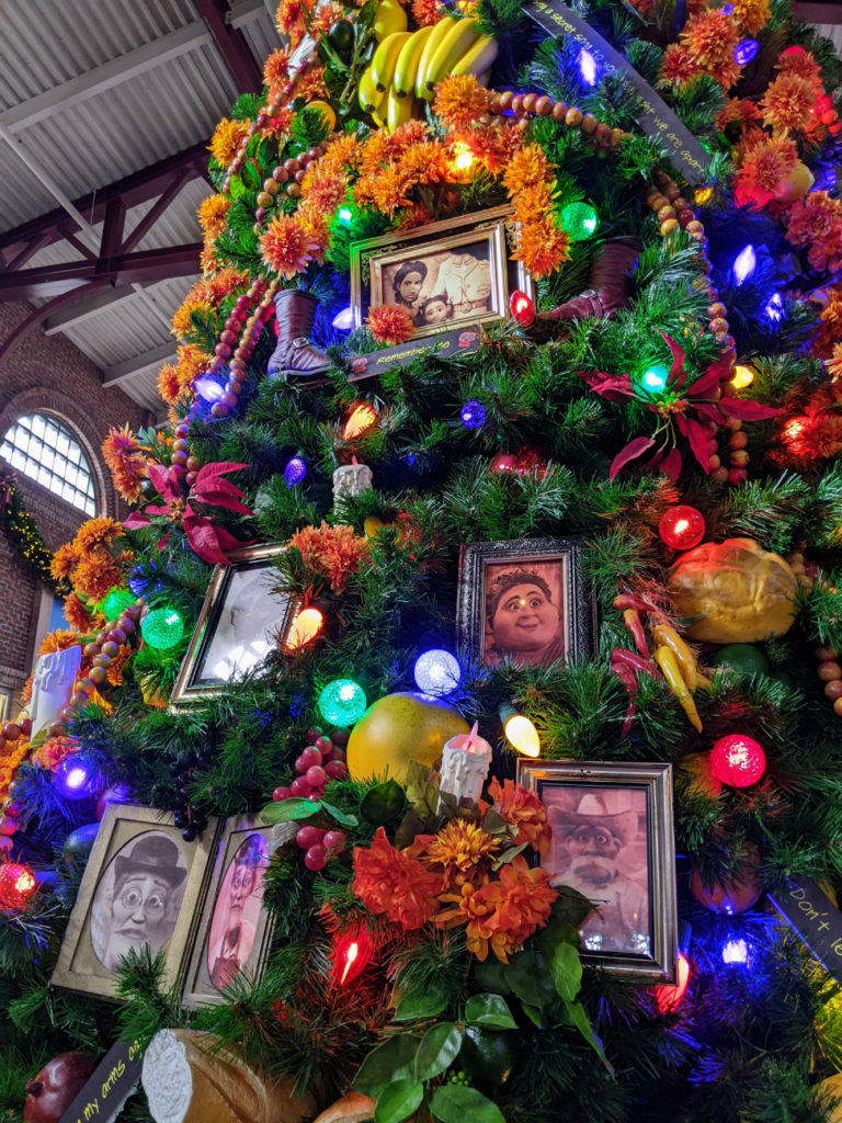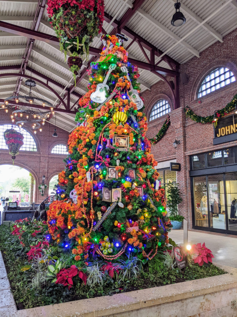 The Polynesian Christmas tree is housed in a bamboo planter and festooned with TONS of tropical flowers. There’s also pineapples, fish, tin ornaments, gourds, drums, and some wooden pieces. Sprays of bamboo shoot out the top.