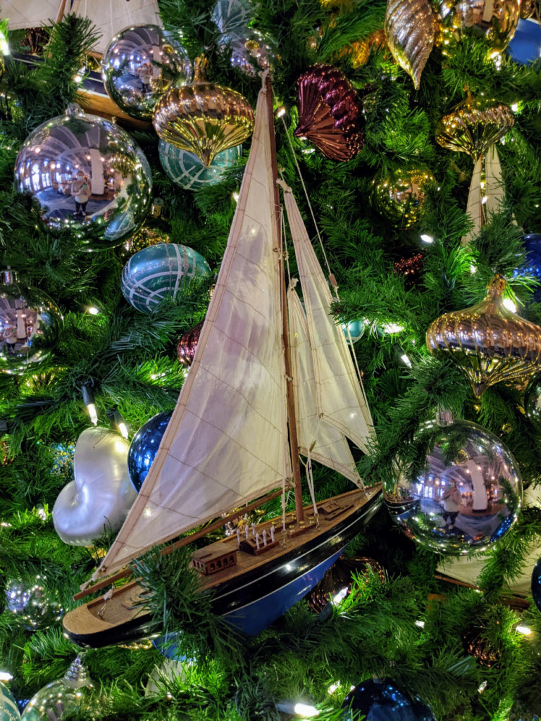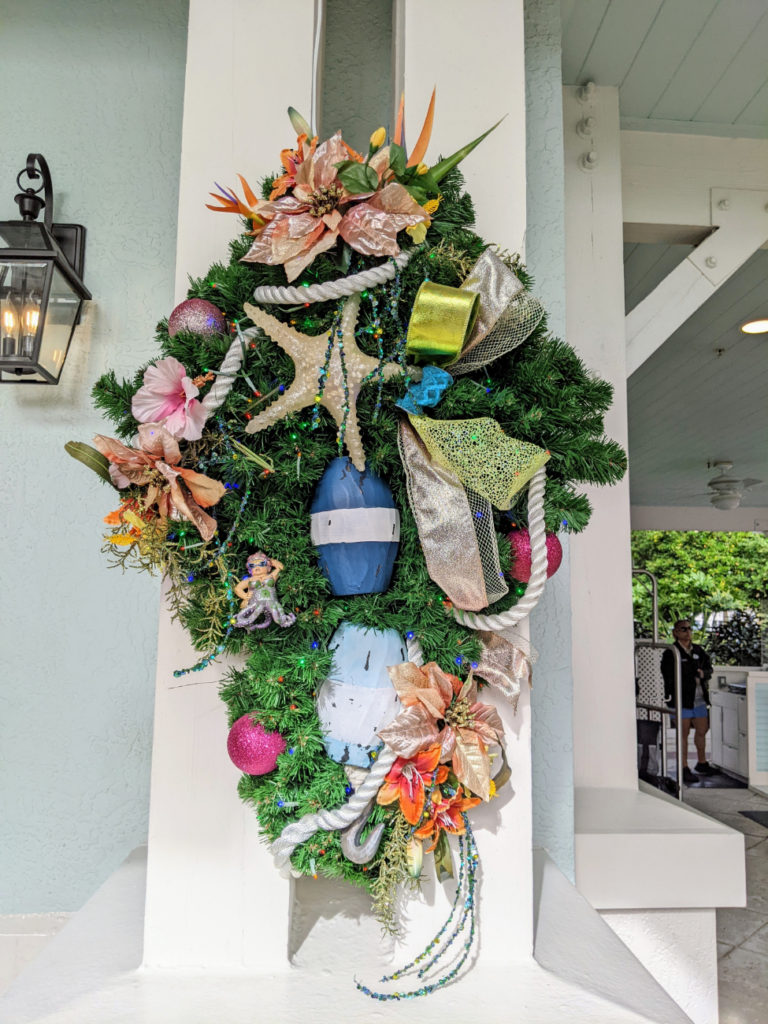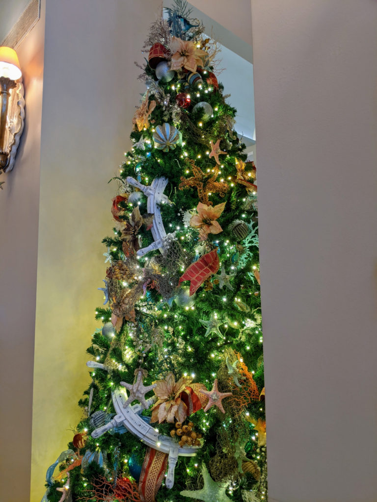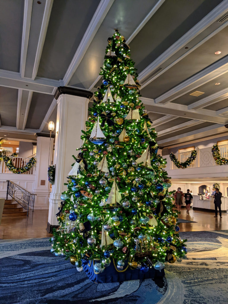 Around the Epcot/Cresent Lake resorts you find the Beach Club has an appropriately beachy-themed tree. Two of them, actually, but they are kind of jammed between pillars and a bit harder to take pictures of (at least, without stepping on other people.) The Beach Club tree features starfish, netting, coral, knotted balls, and most notably, huge portions of a ship’s wheel.