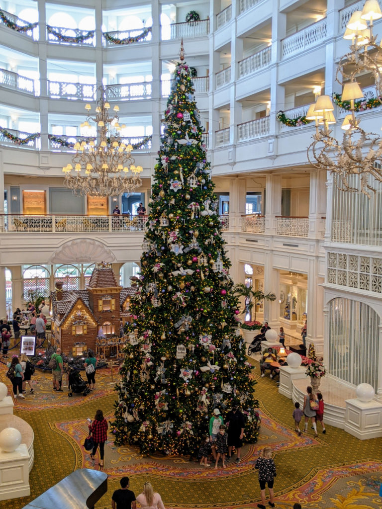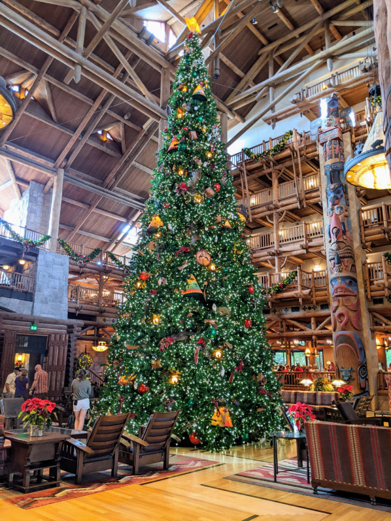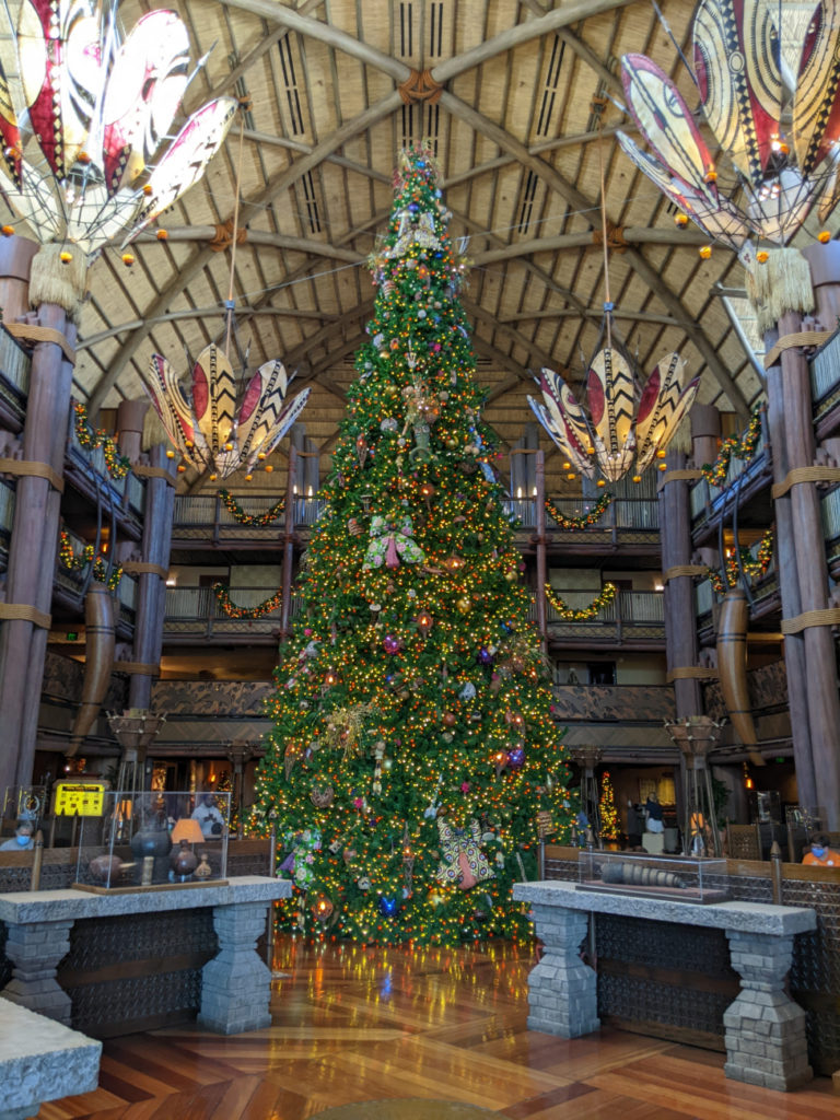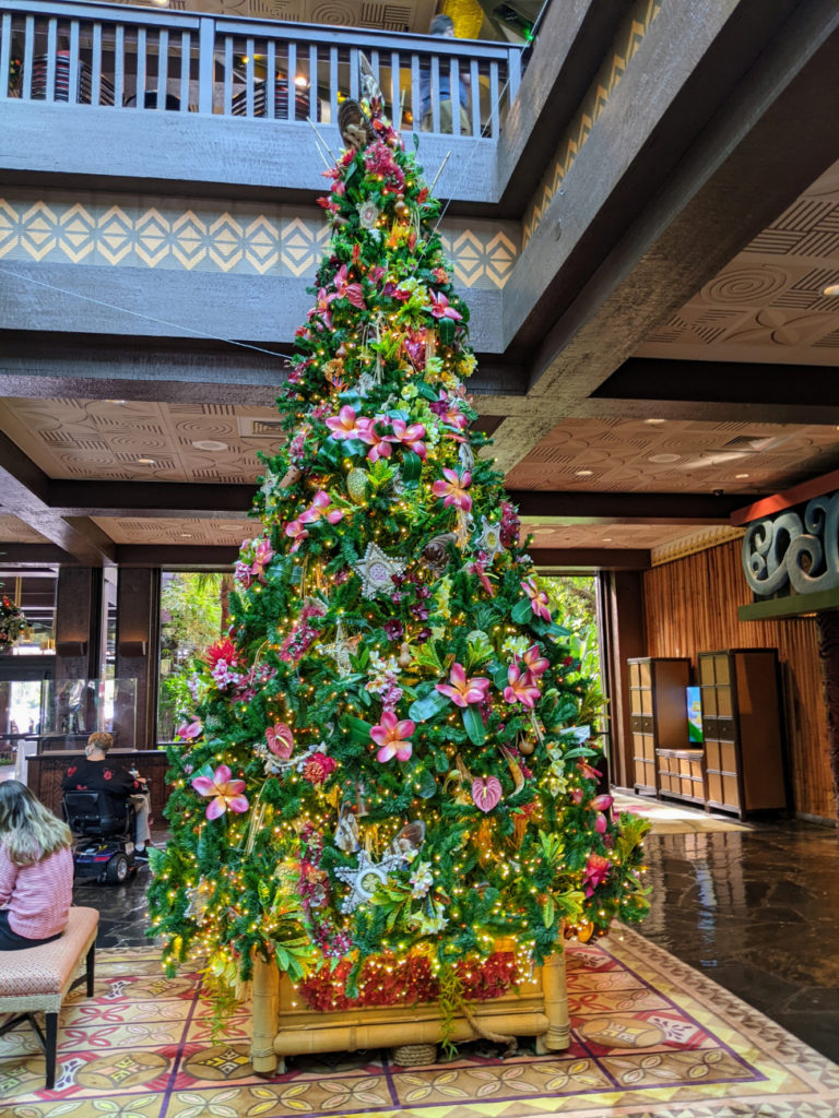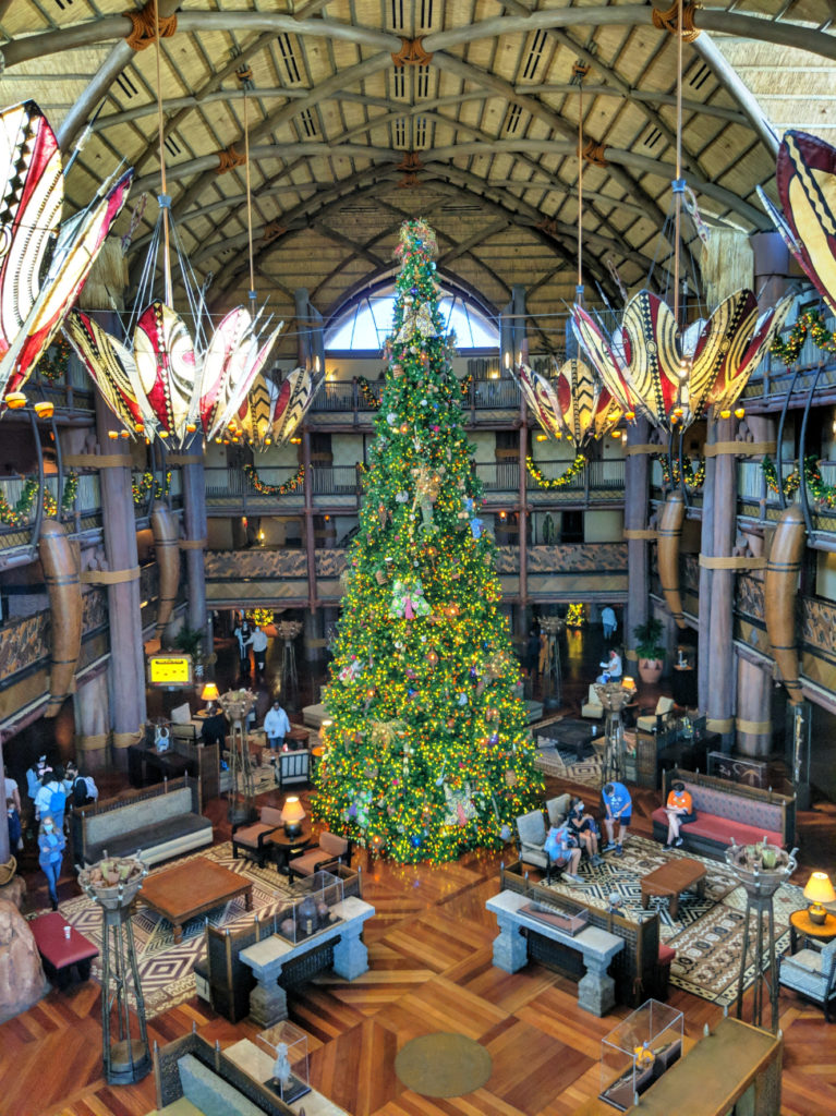 To illustrate just how much more detail Disney puts into their Christmas decorations than Universal, let’s start with the Polynesian Village Resort. And while the Poly has a soaring lobby, due to the tiki welcome statue in the middle, the Christmas tree is around the back.