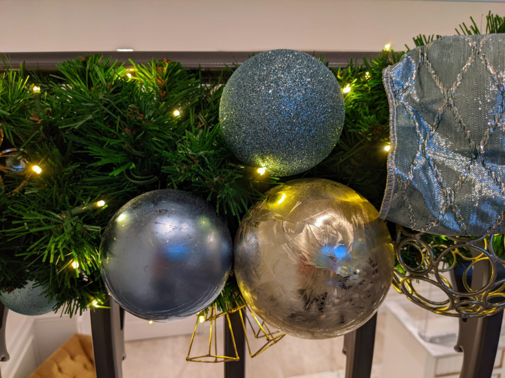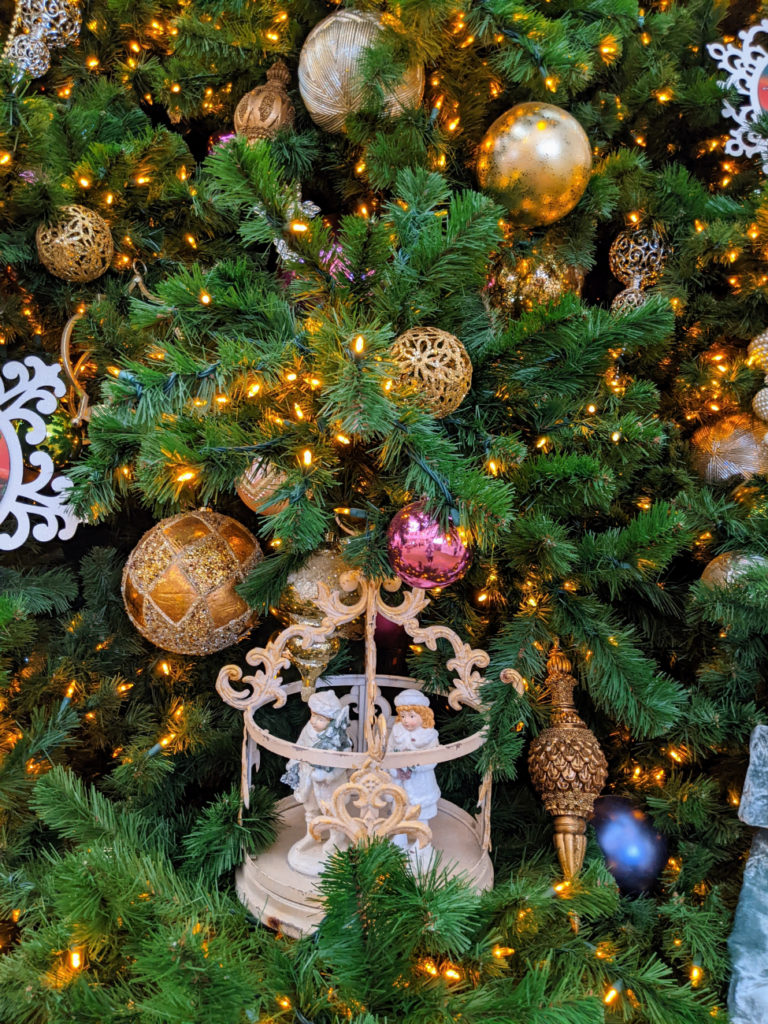 The vaguely French-themed Riviera Resort features a small tree but I think it’s really pretty. It features oversized metal ornaments, and I especially like the spangly tree topper.