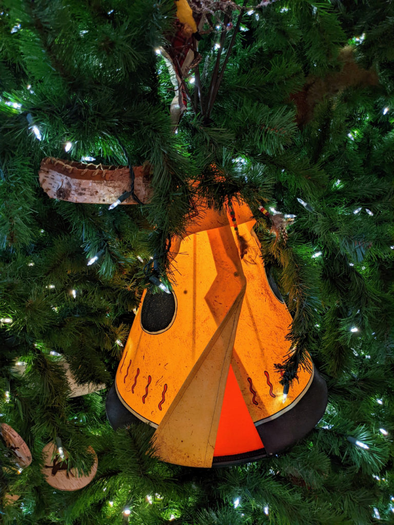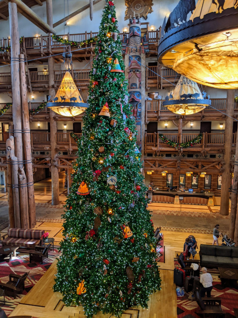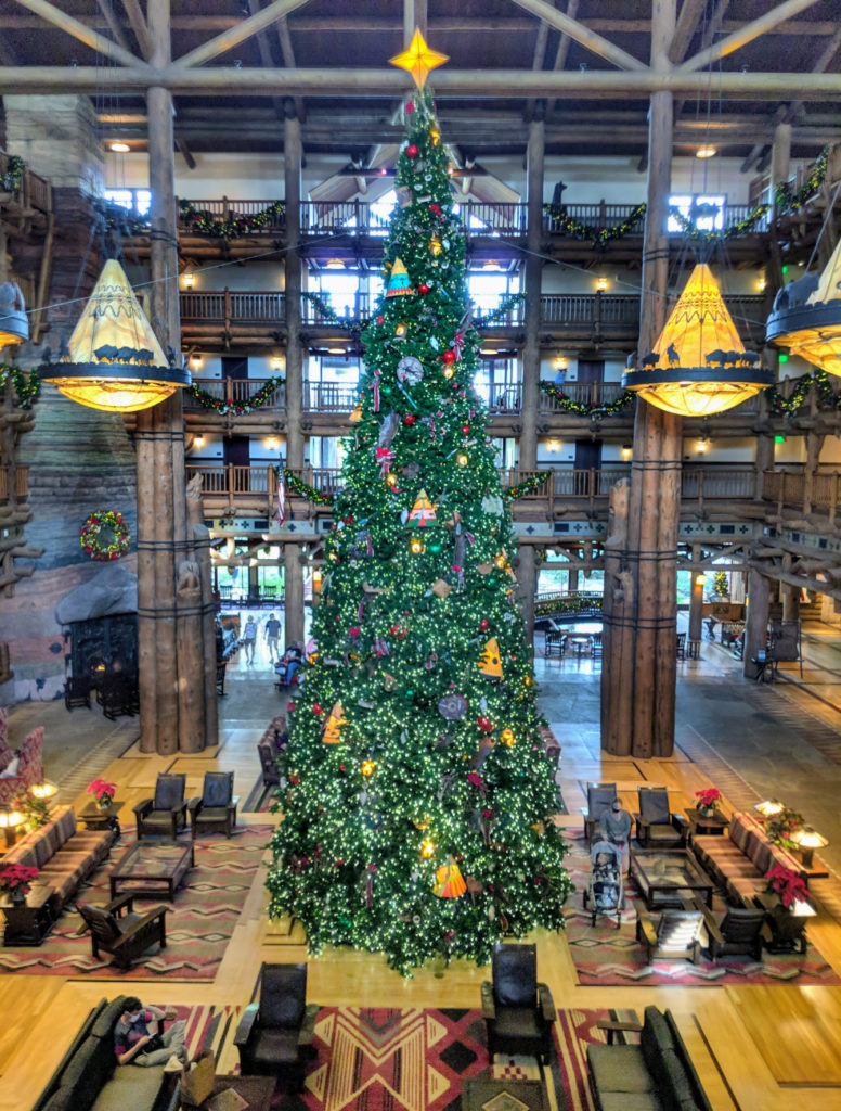 The three biggest indoor Christmas trees on Disney property are in the Grand Floridian, the Animal Kingdom Lodge, and this one in the Wilderness Lodge. (I could be wrong about that, but I’m pretty sure that’s true.) The internet says the Wilderness Lodge tree is 60 feet tall! And it’s decorated with wooden ornaments, canoes, drums, antlers, bows, and large tepees with flickering lights inside them. On top is a beautiful lighted star.
