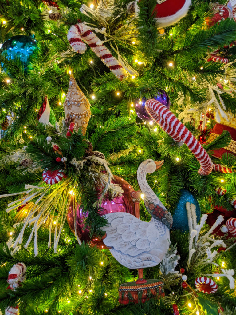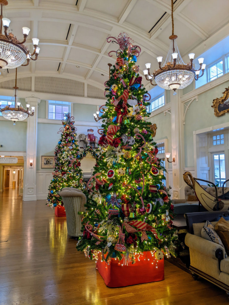 Across the lake is the Boardwalk Inn. They have a larger tree outside in a faux-grass play area, with big swaths of garland and colorful ornaments, bells, and toys. Inside the lobby are twin trees featuring whimsical red & white ornaments and ribbons, victorian animals cards, and crazy peppermint curlicues.