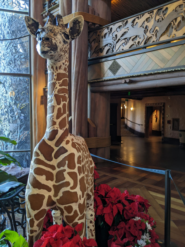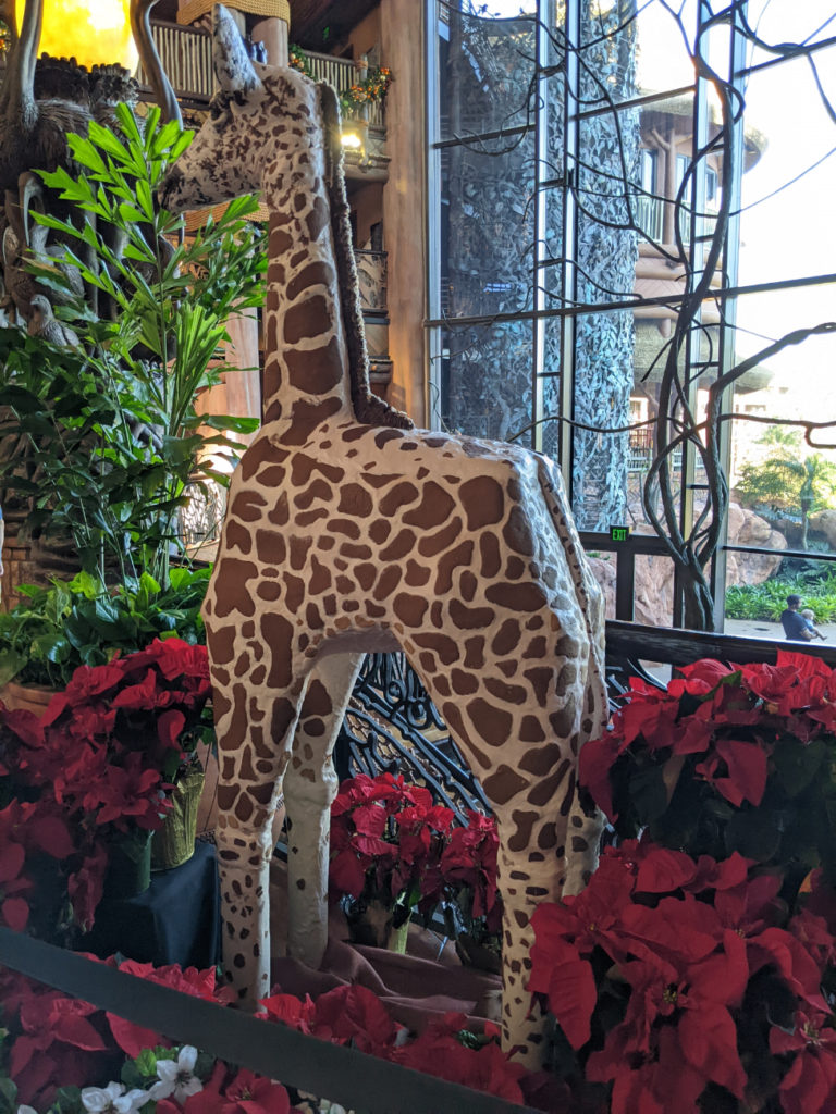 Also at the Animal Kingdom Lodge is a gingerbread giraffe (a “gingeraffe”) which might be new this year. He’s backlit by the large window at the rear of the lodge, so he’s a little hard to take pictures of, but it’s awfully cute.