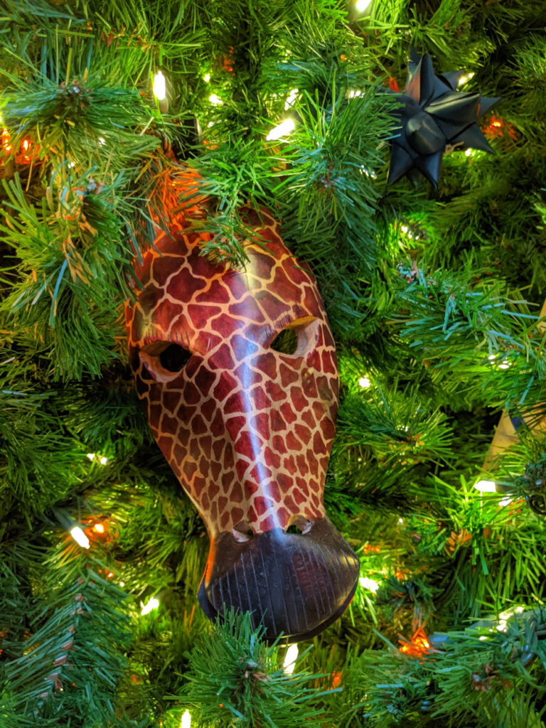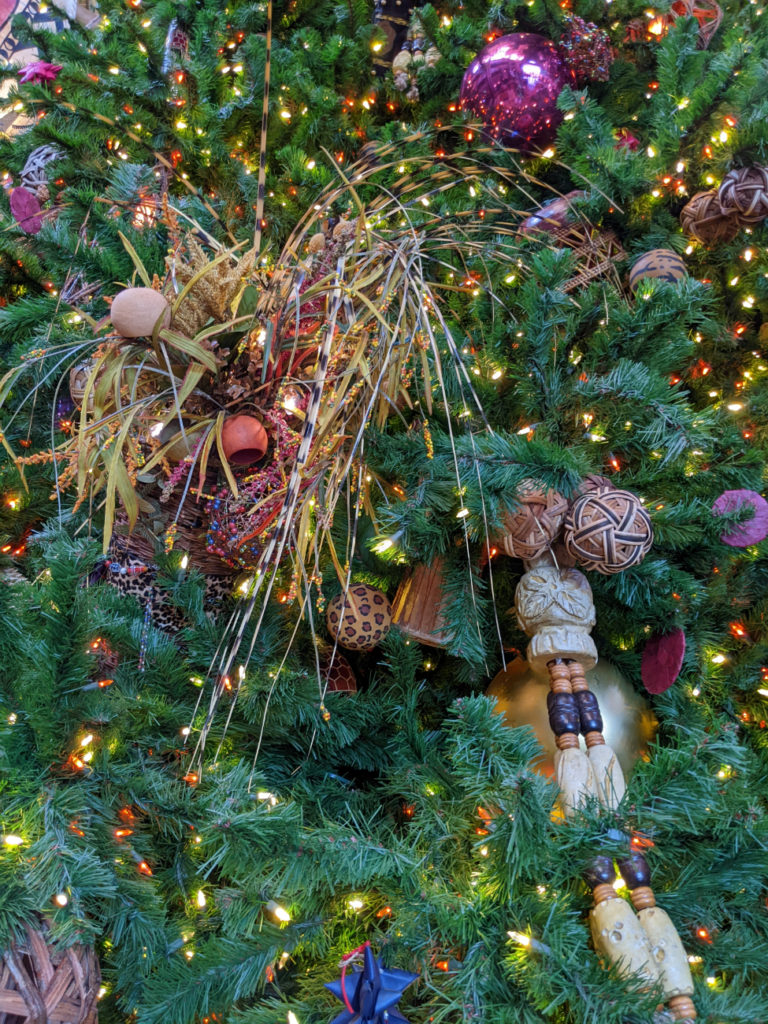 The next day, I couldn’t resist going to visit the third of the really huge Disney trees, the 45-foot one at the Animal Kingdom Lodge. This tree features African-inspired ornaments like large Ankara fabric bows, animal masks, basket-woven ornaments, and natural materials.