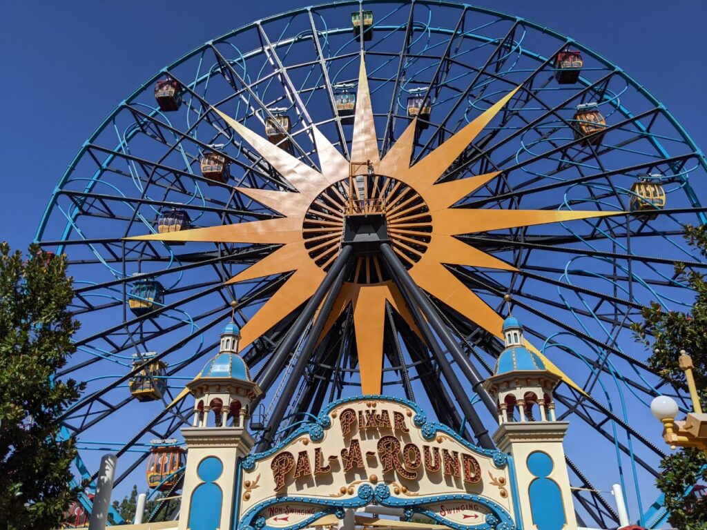 The giant Ferris wheel at the back of the park is called the Pixar Pal-A-Round. There are two types of gondolas, with separate lines for each. Eight stationary gondolas offer beautiful views of the park and the surrounding area on a gentle, normal ride. The Sixteen swinging gondolas might keep you hanging on enough that you never look outside! Sliding along an oval-ish track as the wheel turns, you get some really big swings several times during an entire ride. All gondolas seat eight people, so you may be put in with other parties.
