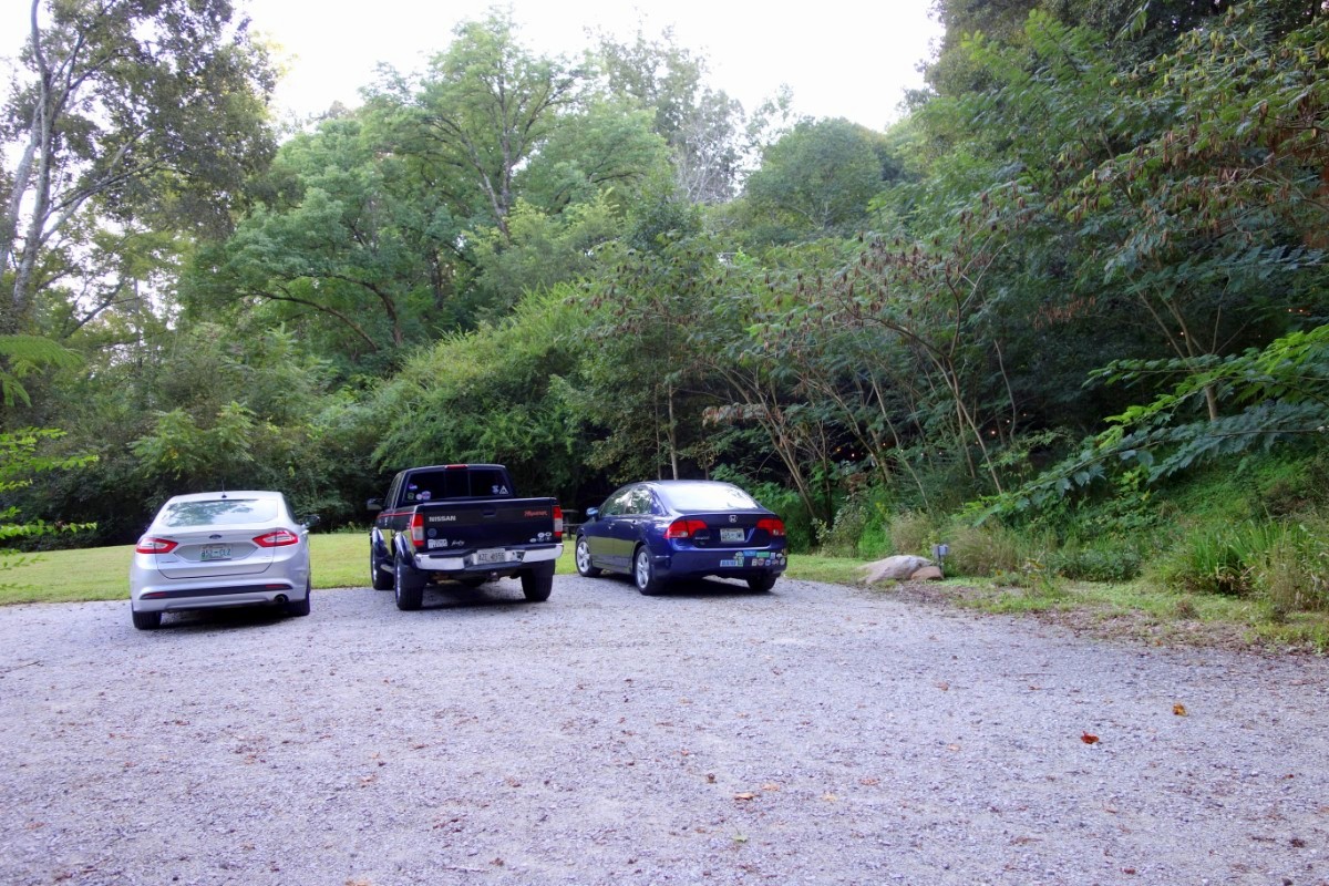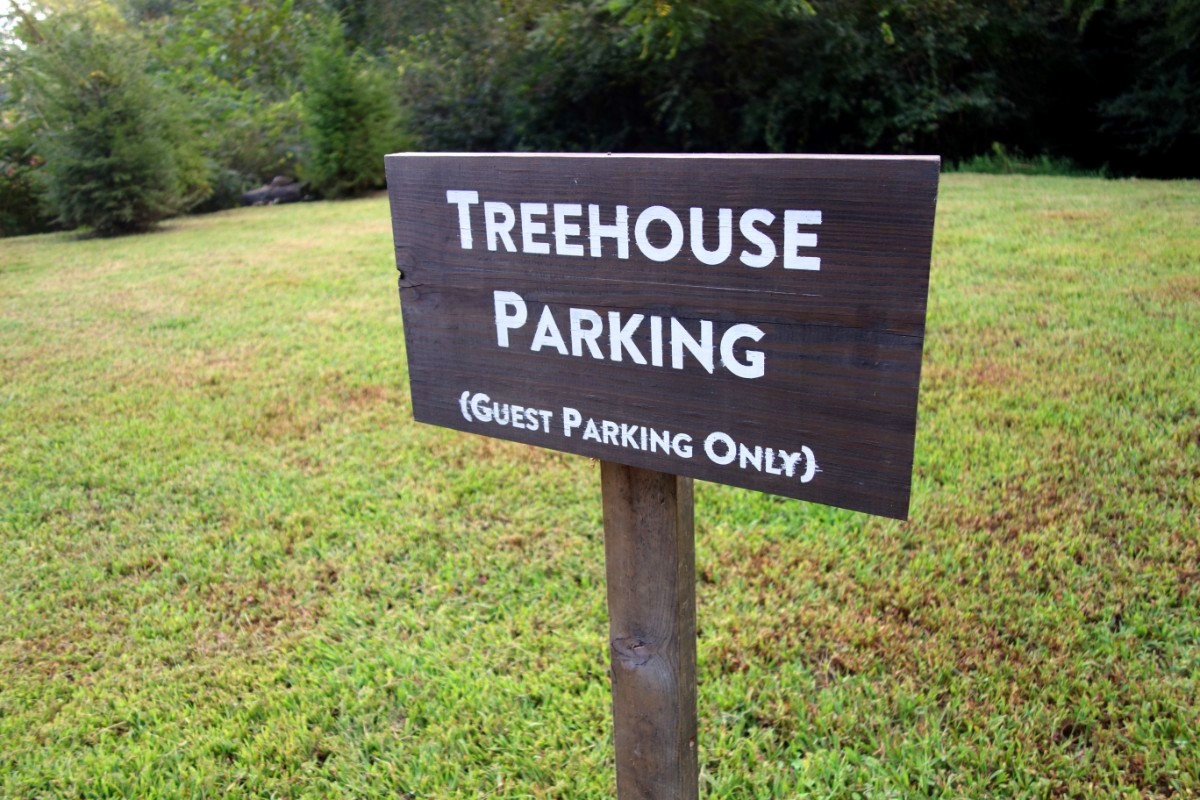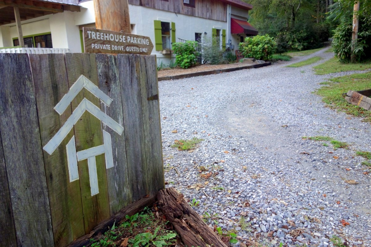 The gravel drive is short, but the parking area is shielded by a stand of bamboo. Drive past this circle and you’ll find parking for about 3-4 cars and a mulch path towards both treehouses. Leave your flip-flops and heels at home–it’s not much of a hike, but you’ll need relatively decent shoes to make it up the hill.