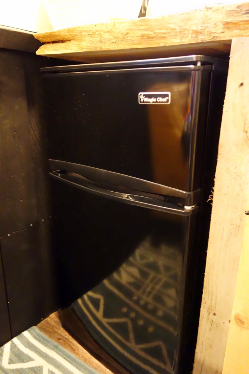 To the right of the seating area is a deep sink with a small fridge and trash can behind the cabinet door. There’s no microwave.