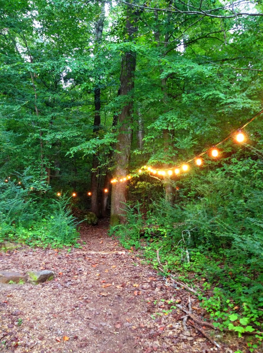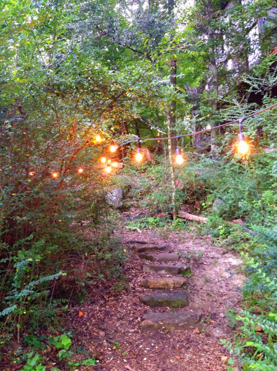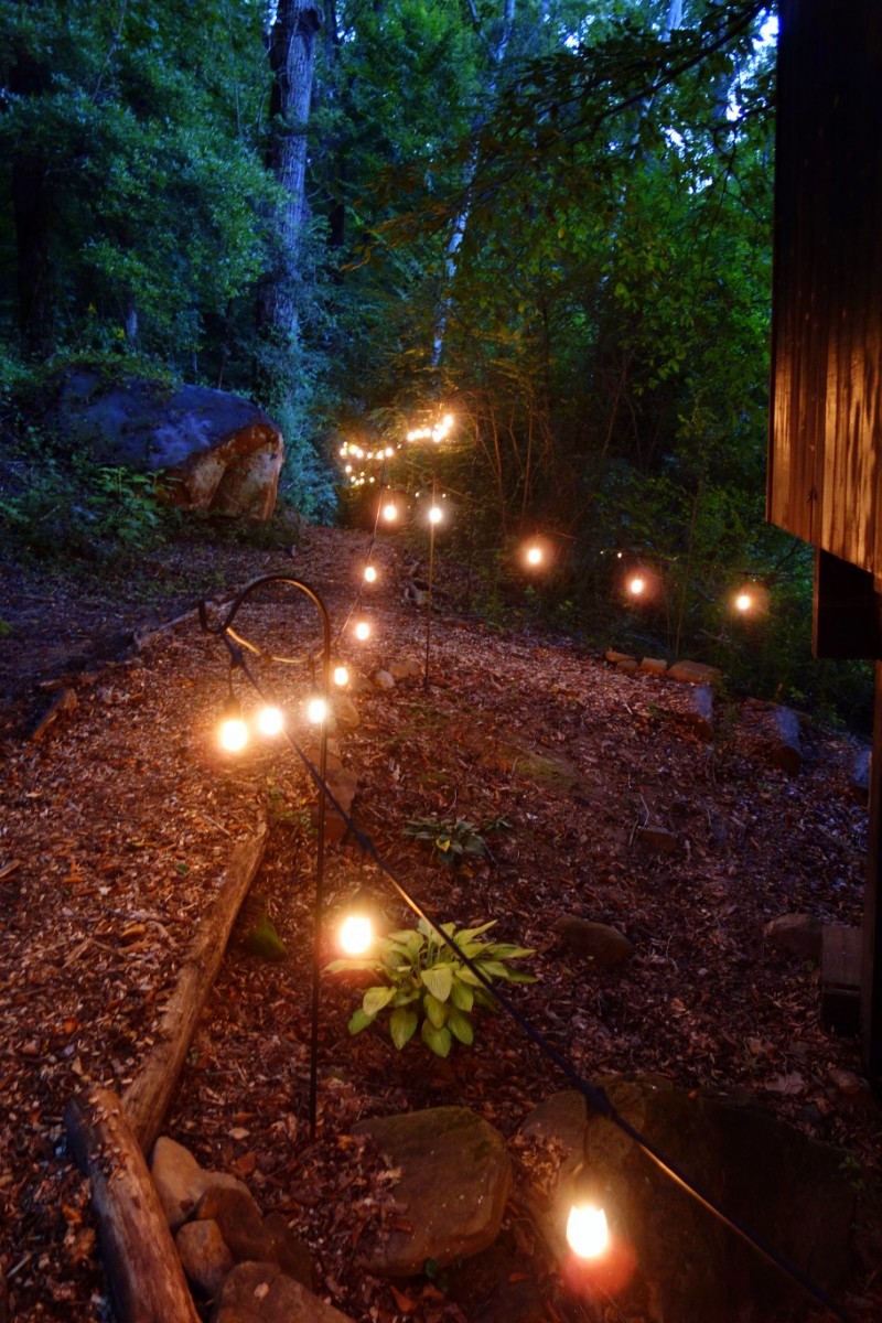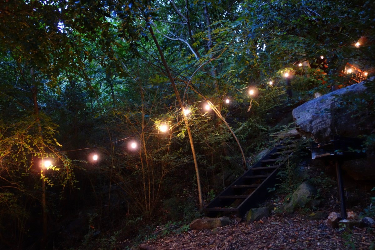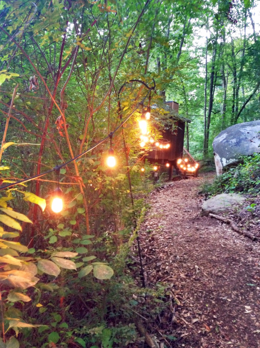 At the end of the string lights, there are steps up to the front door of the Elements Treehouse!