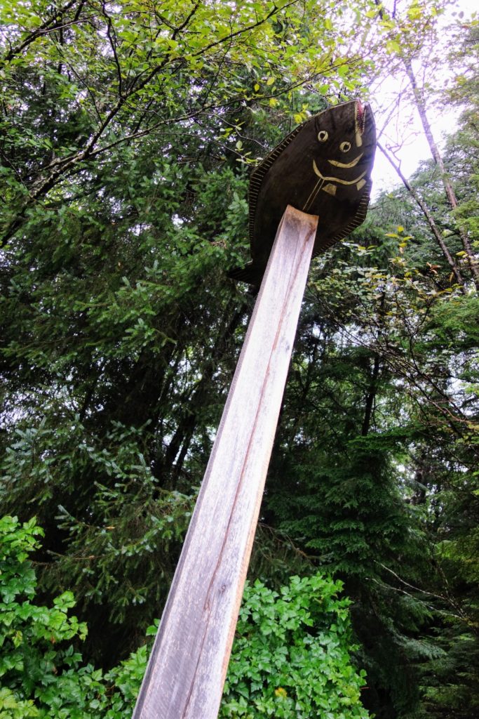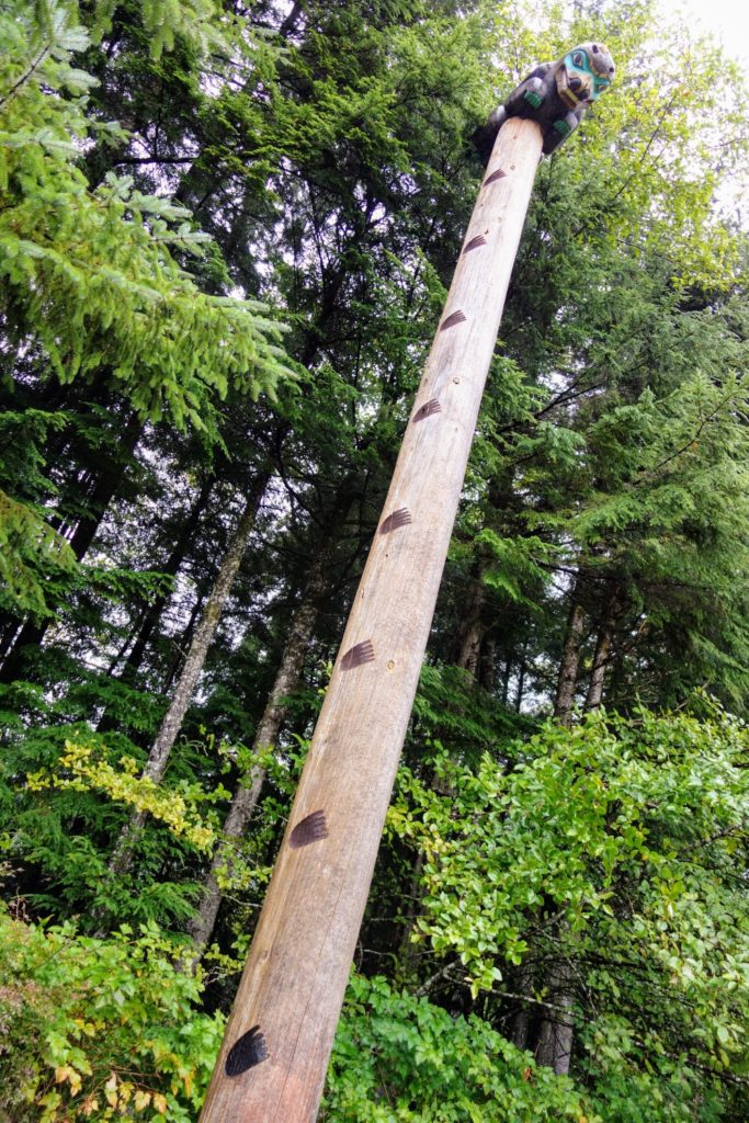 There is a short and sweet walk through the trees to a clearing next to the inlet. In a circle around the clearing are several totem poles, all recreations of the originals. Some have character after character stacked up the pole in a sort of story, and some just have a fish on top. I liked one with a cute bear looking down with paw prints all the way up the