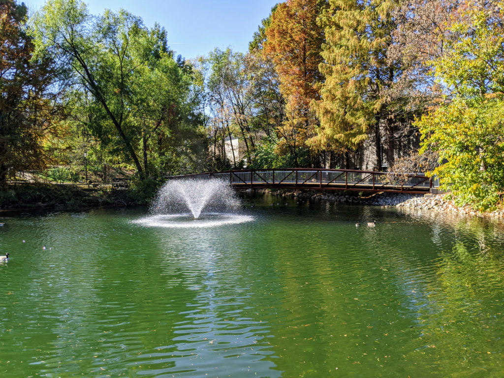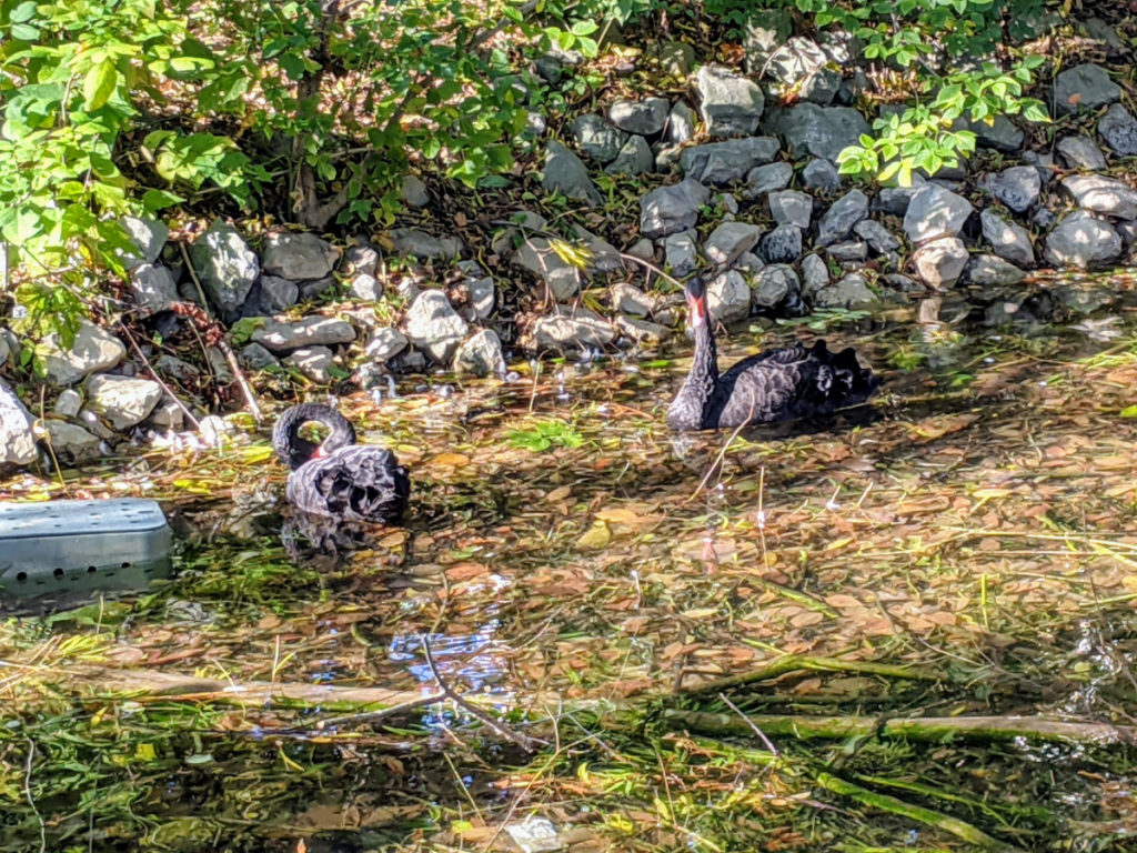 Next is a little lake area with a pretty bridge and fountain. In the lake, you’ll find black swans, turtles, and probably some Canada geese. The official route goes around the back of the lake and across the bridge, which is a pleasant walk. Or you can cut it short by going past the ropes course.