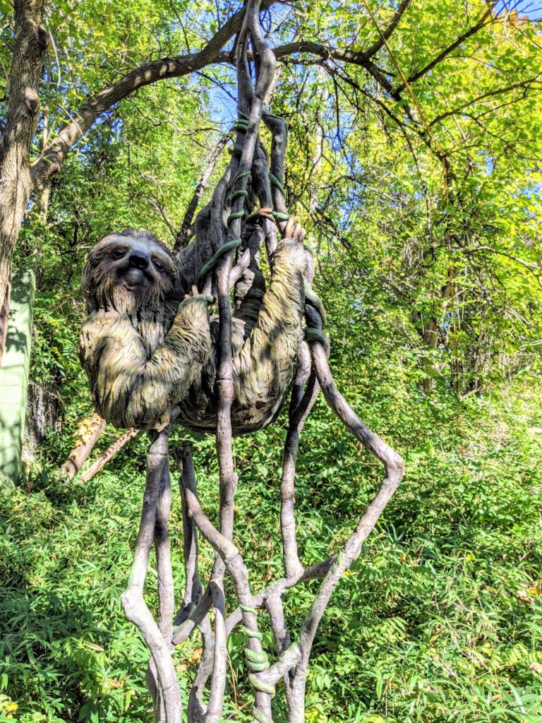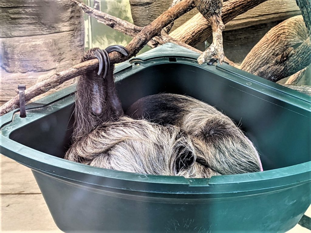 Next is a sloth exhibit, new to the zoo. At some point soon, you’ll be able to pay ~$95 for a “sloth experience.” I hope for that price, it means you get to hold one! When I stopped by, there was one curled up in a bucket.