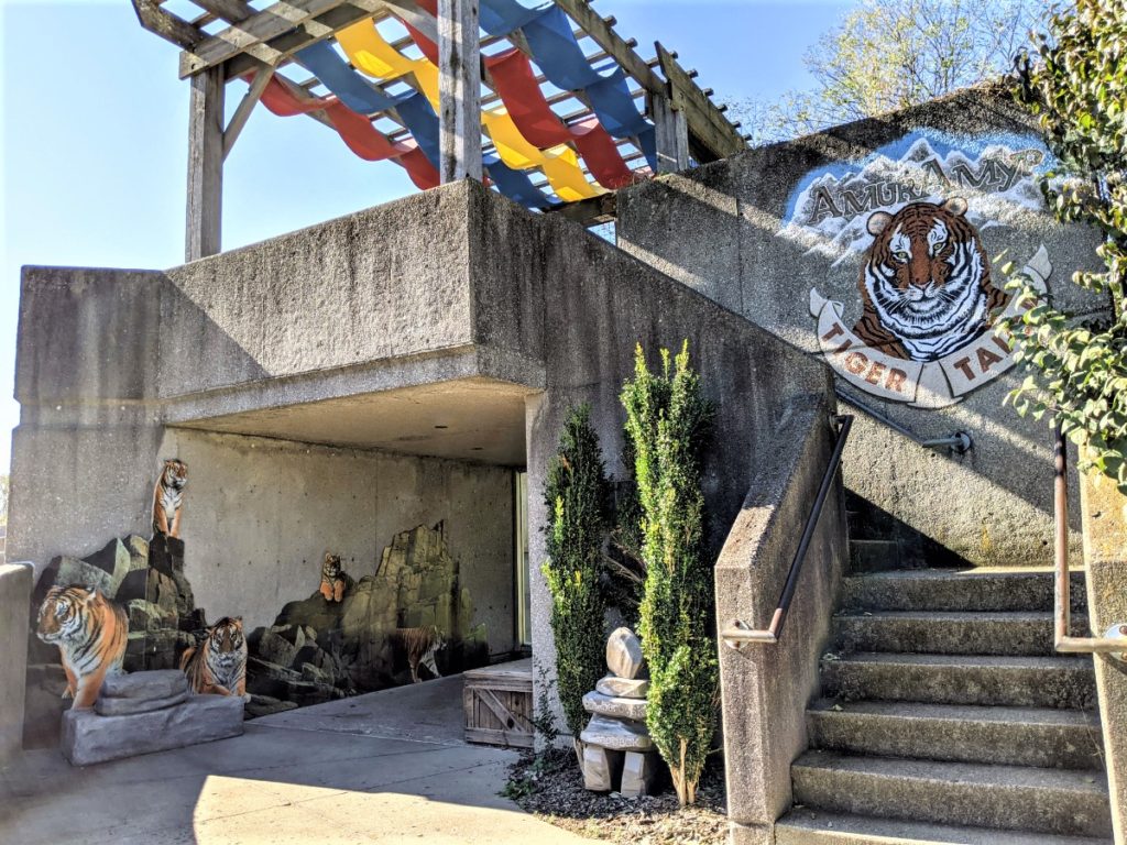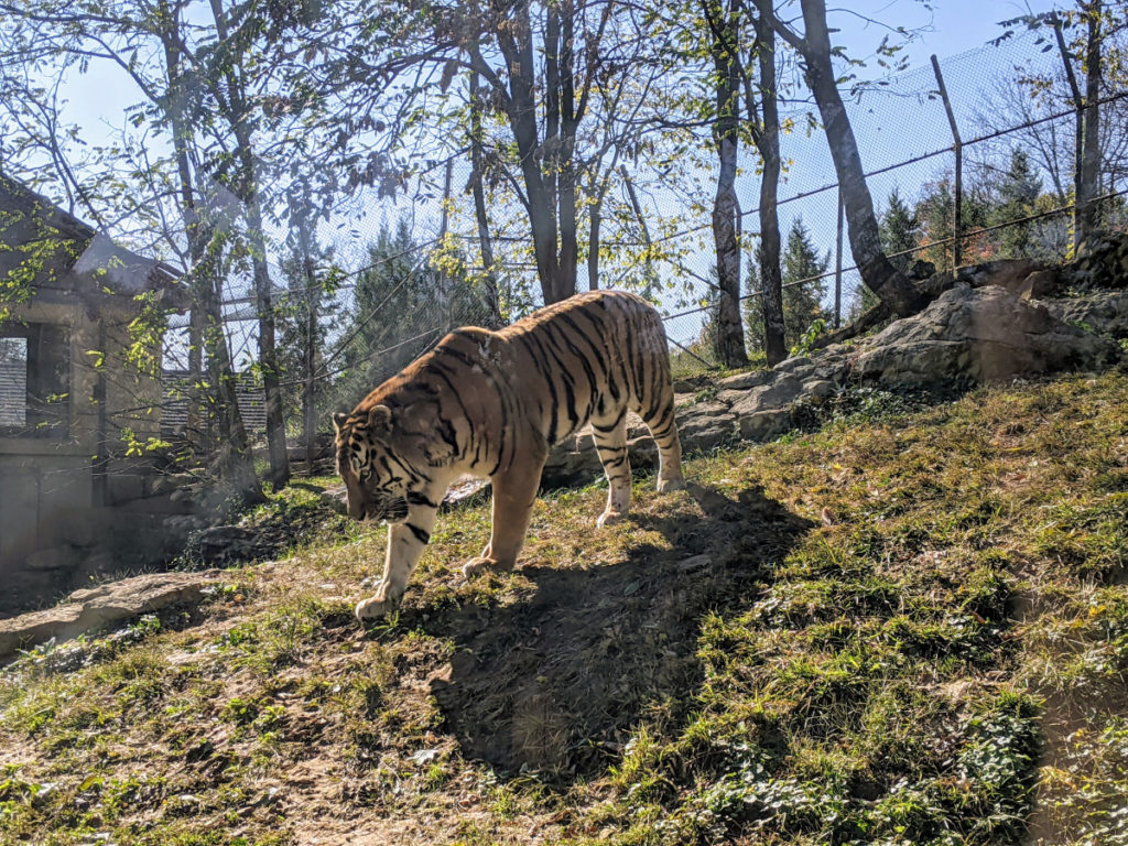 The tiger has a bit of a hillside that he can wander around. Again, both habitats allow you to get pretty close to these beautiful animals.