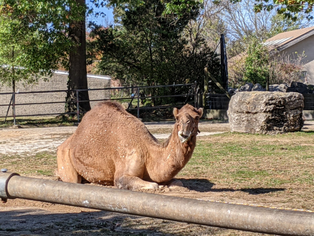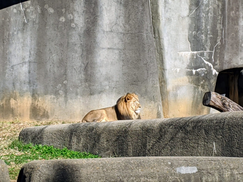 The next stretch contains the zebras, lions, and some camels that I think normally are available for rides. You can’t get quite as close to the lions as you can some of the other big cats. Instead, they get a far-off rock outcropping to sit on.