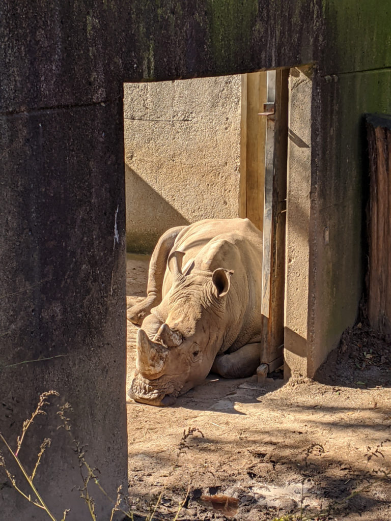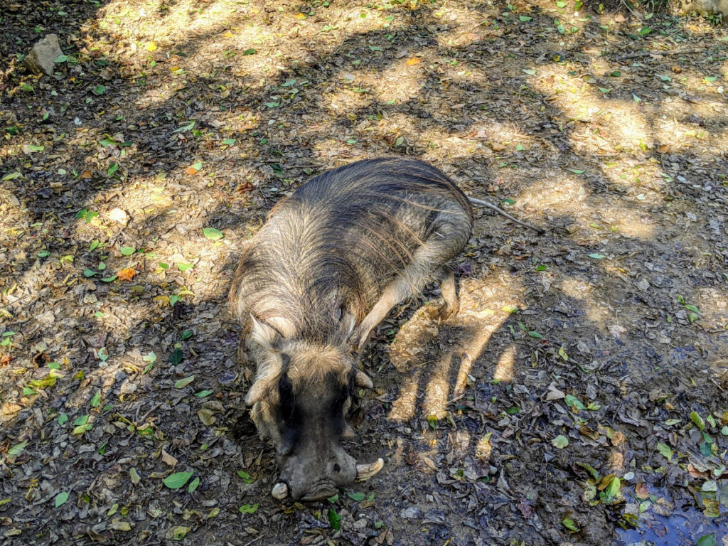 Almost at the end of the loop is a rhinoceros, whom I spotted lazily basking in the sun, and some friendly warthogs that ran to the fence whenever I would walk up. I think they must have thought they were getting fed – they were pretty cute.