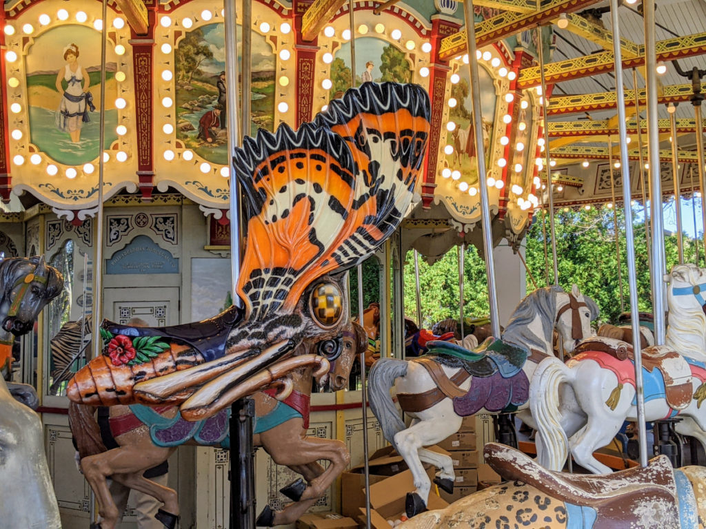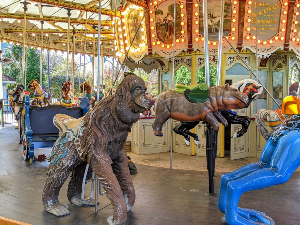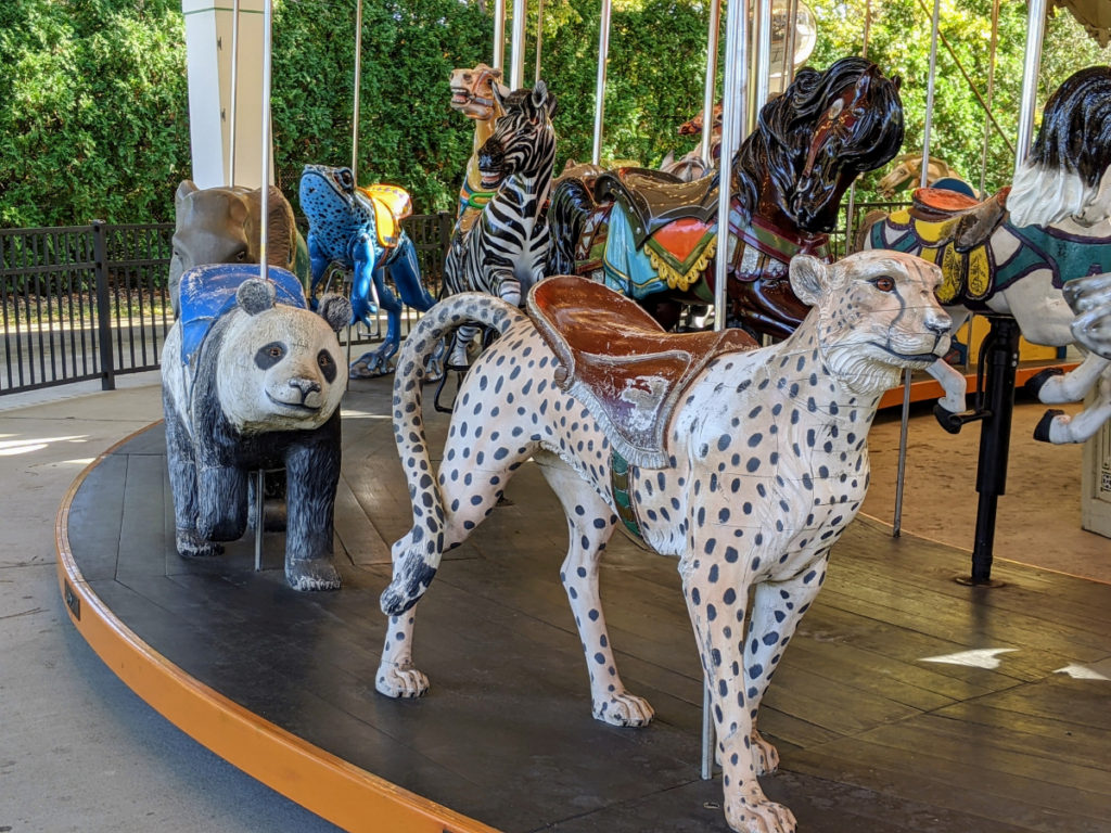 At the end of the route is a round rock hill for lemurs (none were out) and a colorful carousel. The only currently operating paid attraction in the park, the carousel is carved with lots of unusual animals like polar bears, frogs, gorillas, flamingos, even a butterfly! Cost to ride is $3.50 but an all-day pass is only a dollar more.