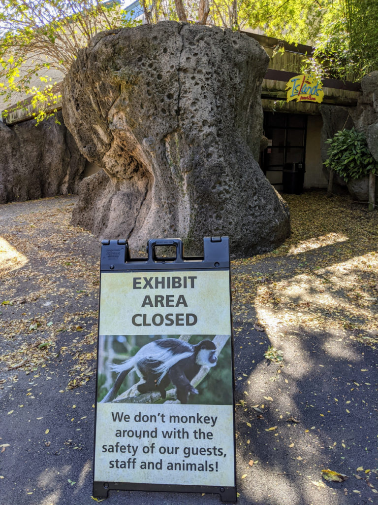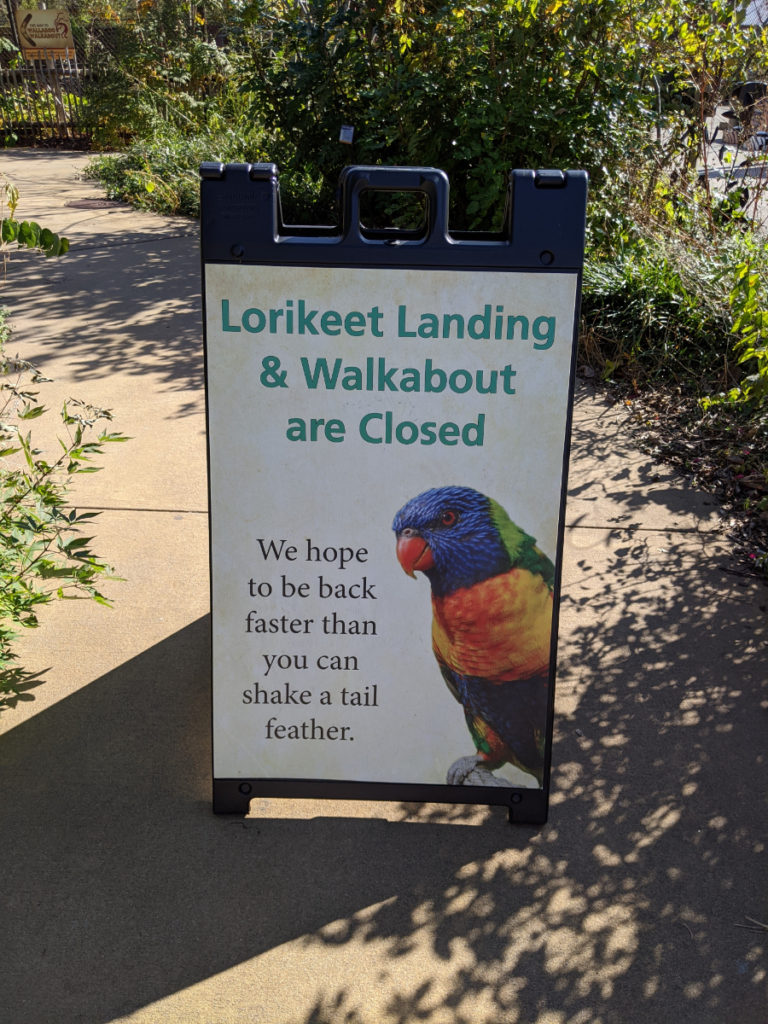 There are several exhibits and experiences closed during Covid, however. Basically, anything indoors is closed, plus a train and tram that normally help move guests around. In fact, between the closed areas and the fact that it was a chilly day, I didn’t see an animal at all until after about 15-20 minutes into the loop! Some animals are only out when it’s above a certain temperature. But ticket prices reflect this, at least. Tickets in the fall and winter are about half as much as they are in the spring and summer.