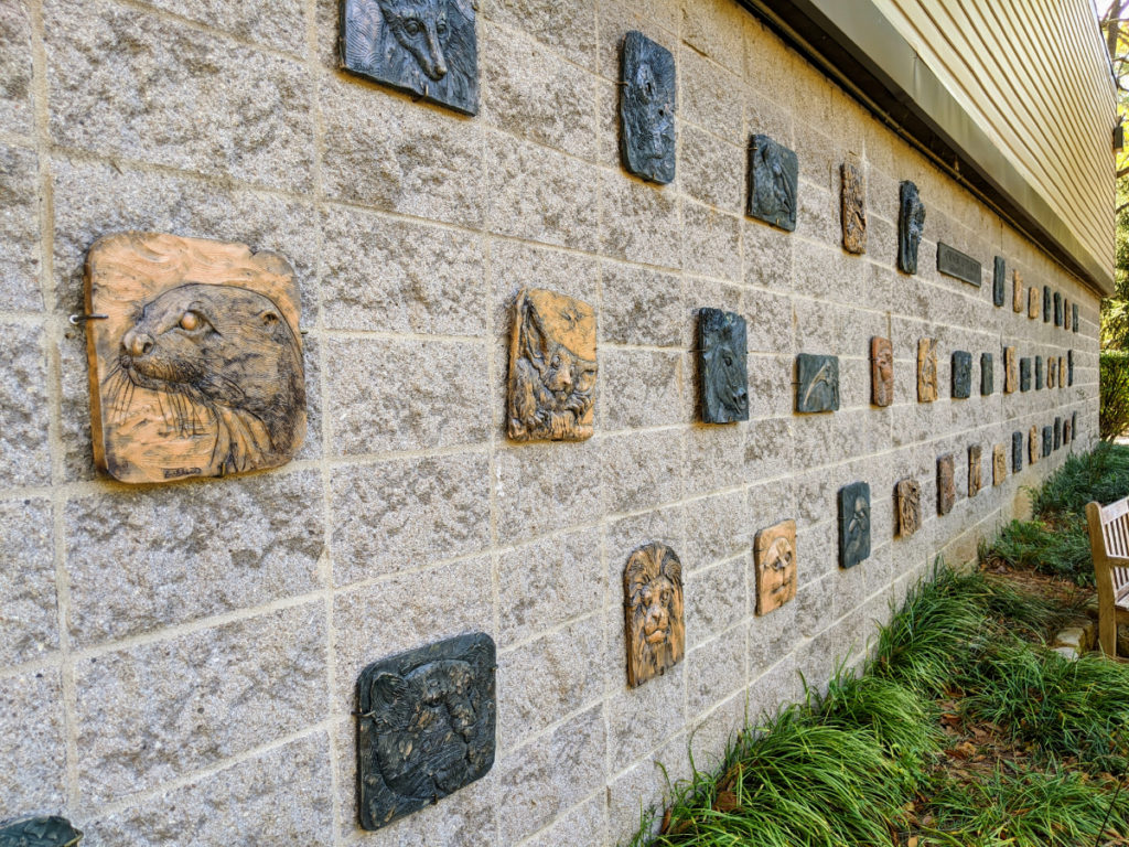 The last building in the area is called the MetaZoo, which looks like a school group building. There are lots of rooms scattered around that are for group or educational use. But on the side of that building is a fun collection of sculptural tiles. I think they depict endangered species, but I could be wrong on that.