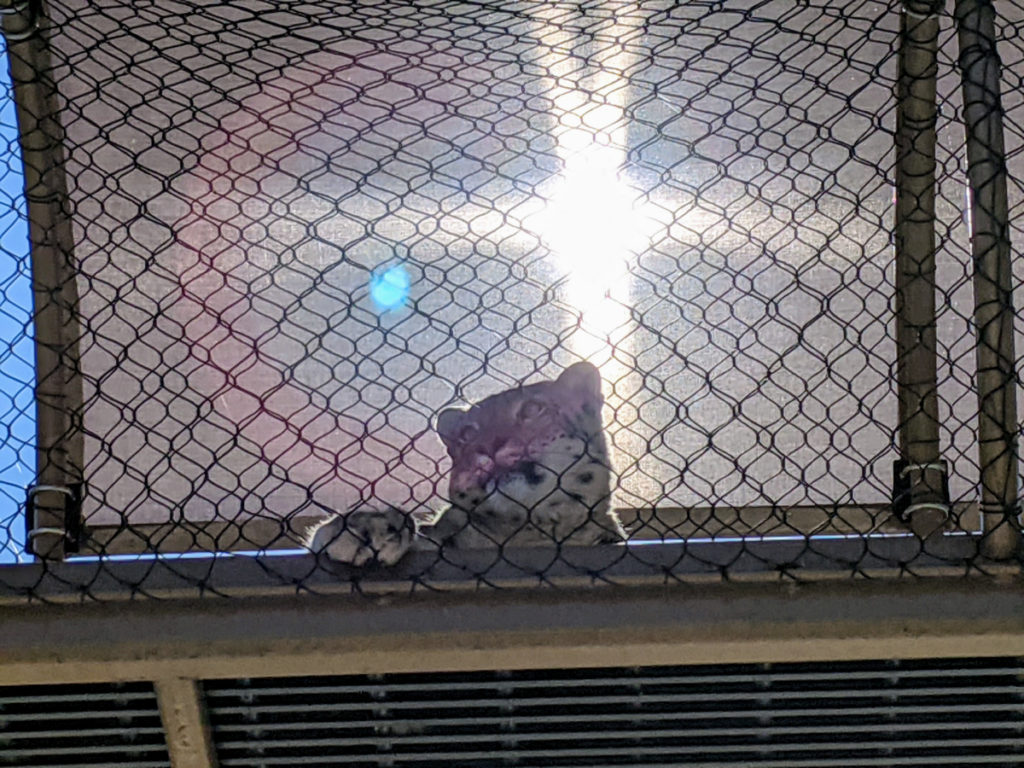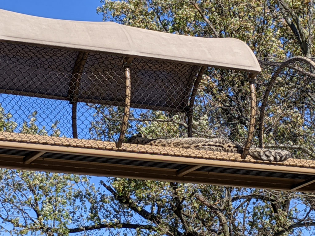 The snow leopard has a cool overhead walkway! On my second trip through the zoo, I spotted him up there. The first time, he was closer but was eating behind a rock, so not a great picture either way. I guess they like the elevation.