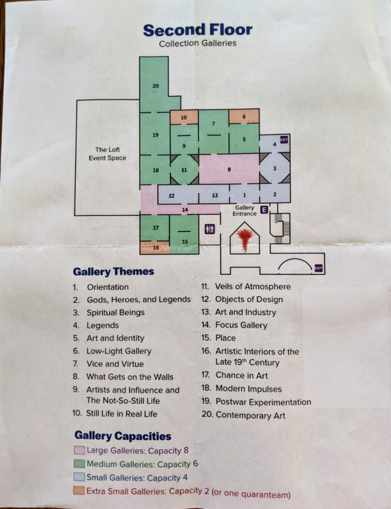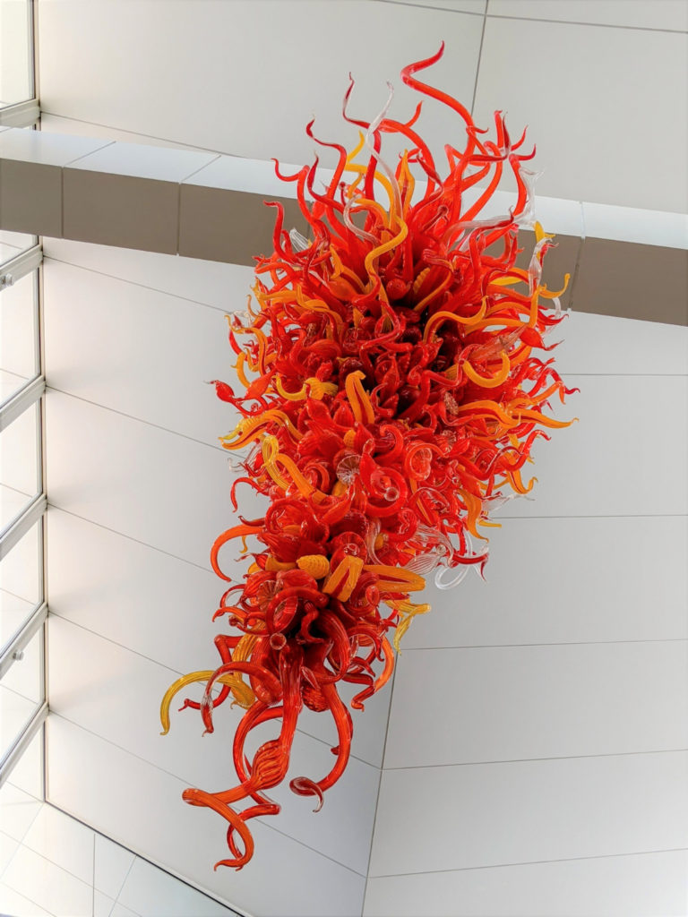 The lobby is a bright, open, white space with a big Chihuly glass sculpture hanging above the reception desk. Even when it’s free, check in at the desk to get a sticker and a map, you’ll need it later.