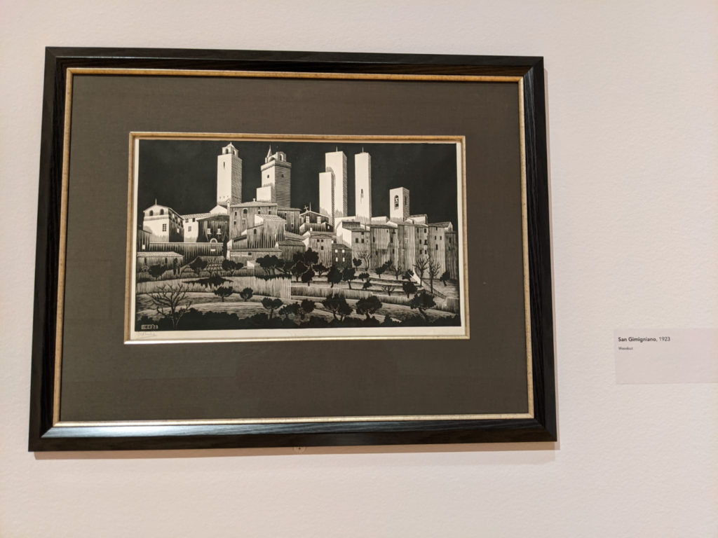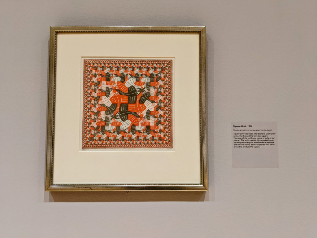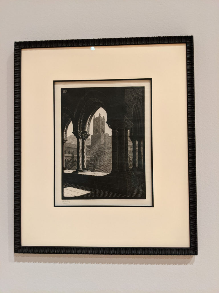 A big draw for the museum is the current MC Escher exhibit. It is fascinating! Room by room, you are guided through Escher’s career and his developing designs and skills. First, you are introduced to his early commercial work. Then you see sketches and prints of his travels (I really liked this part.) Then the way he makes geometric patterns into the figures of animals like birds and fish. And finally, you get to his impossible buildings and stairs and loops. It’s so cool.