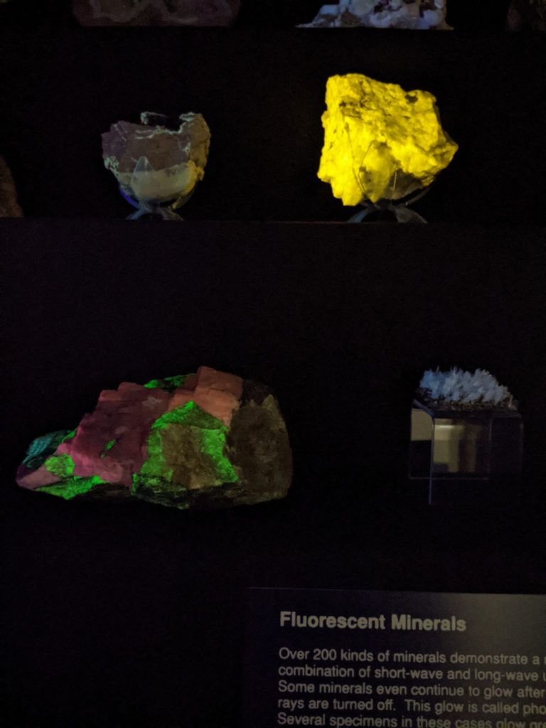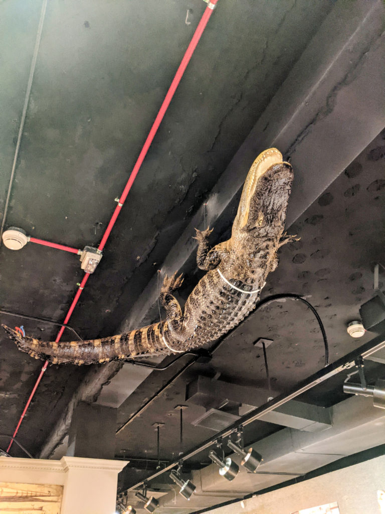 On the third floor, you’ll find a sizeable and extremely varied natural history collection. There are cases of minerals, including ones that glow! There are taxidermied animals, like a lion, a boar…and an alligator on the ceiling. You can find lots of shells and some really cool fossils in the following rooms.