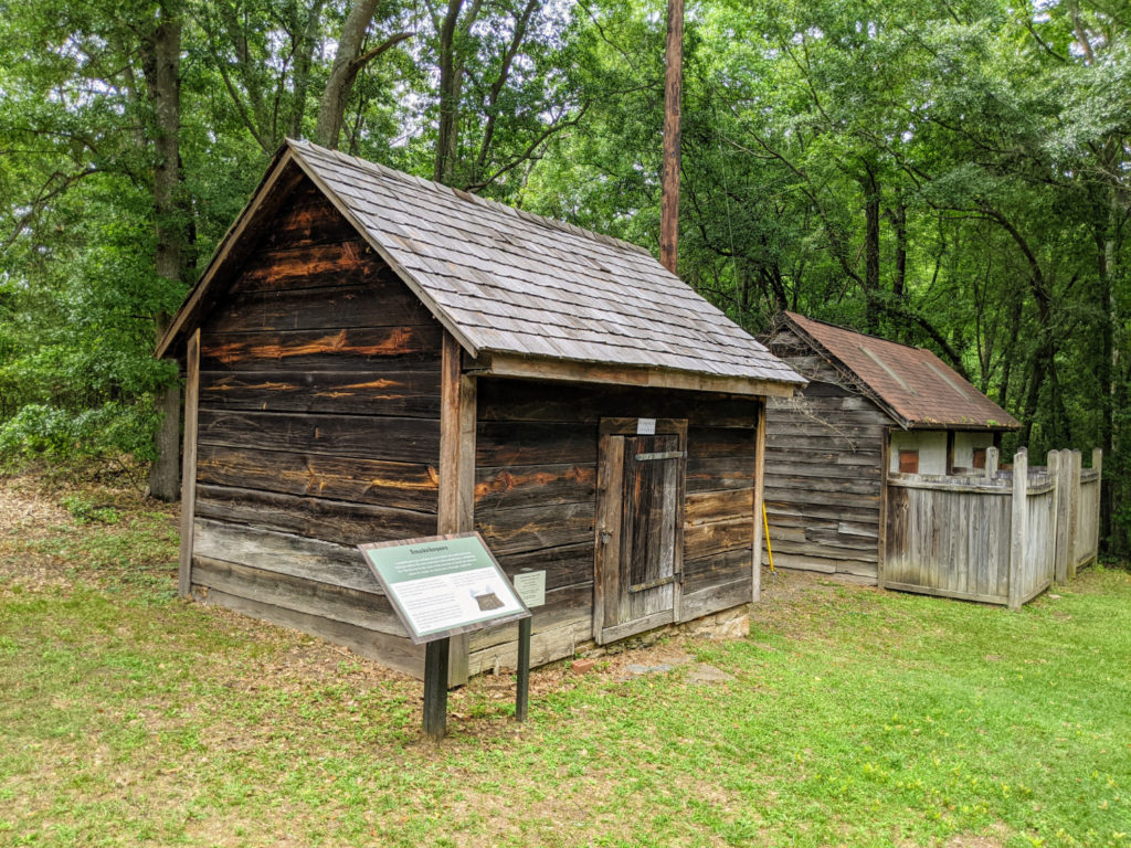 There are a few buildings around the outside of the main house. I think these are used during living history or education days. There’s a small cabin (which might be an outdoor kitchen), a smokehouse, and a train caboose.