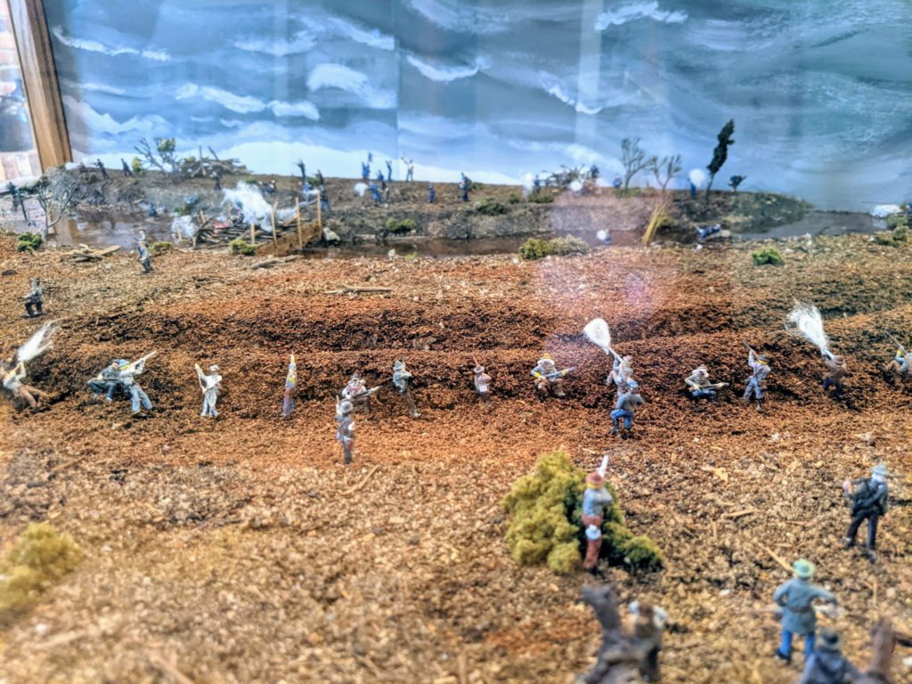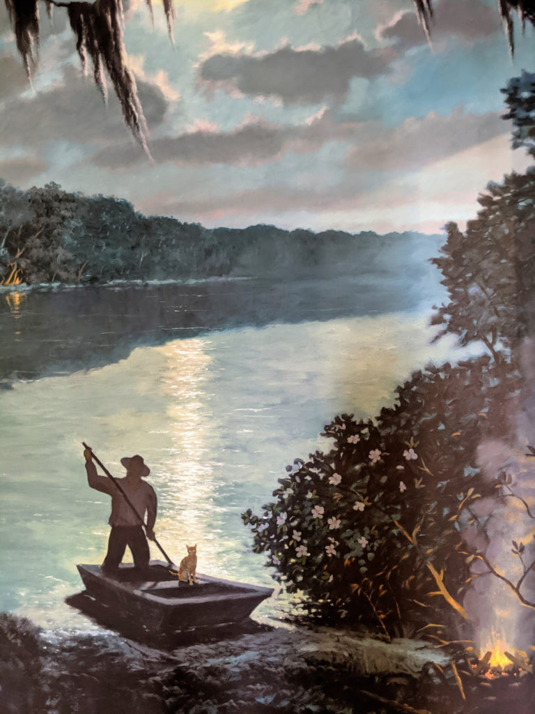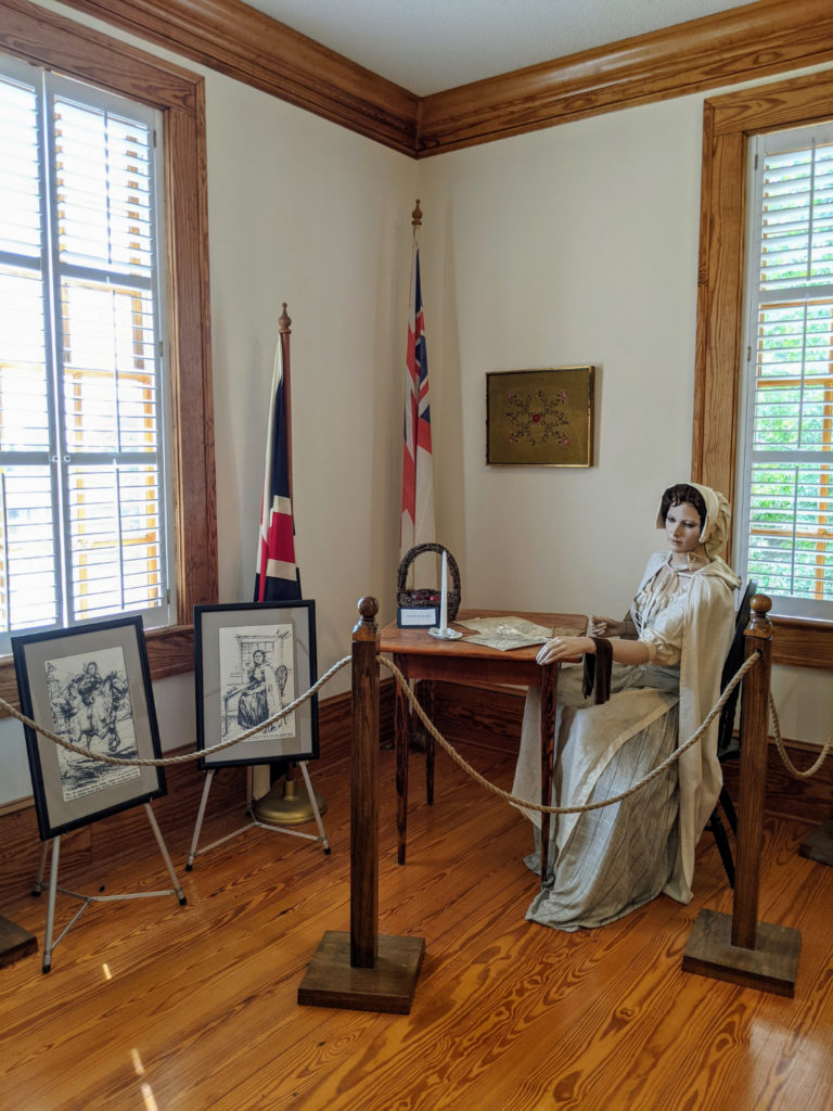 Upstairs is a beautiful blue mural of the river. Don’t miss the cat! (It’s hard to.) On one side is a room partially set up as an inn, with a lady spy (I forget her name) who smuggled messages during the Revolutionary War. Other dresses and home goods are in this room.