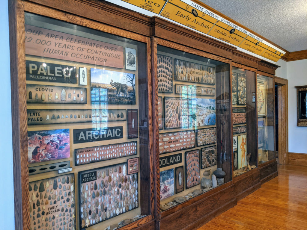Across the hall is a spectacular collection of Native American artifacts, each collected by one local man, Samuel Watson. A wall display and several display tables contain arrowheads, pottery shards, and illustrations of local industry.
