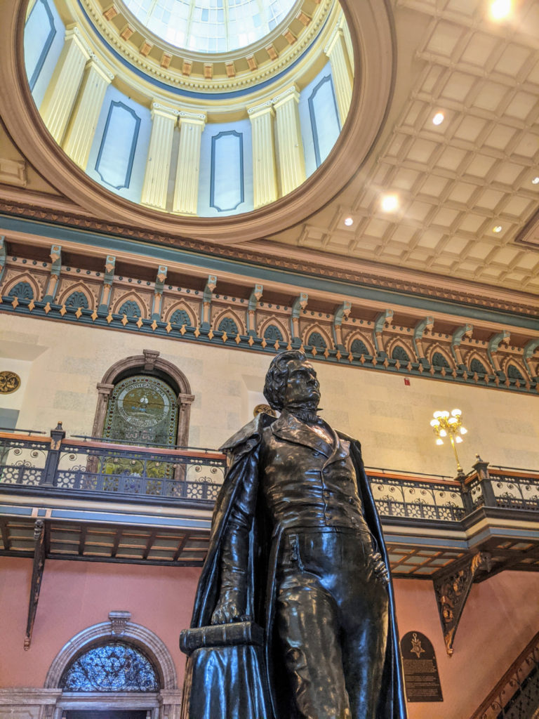 Outside, there are huge marble steps leading up to a grand veranda with huge pillars and a massive door. Don’t go up there except to take pictures. To get inside, use the public entrance around to the side. It’s on the left if you’re facing the State House. You will have to go through a metal detector, so be aware of that.