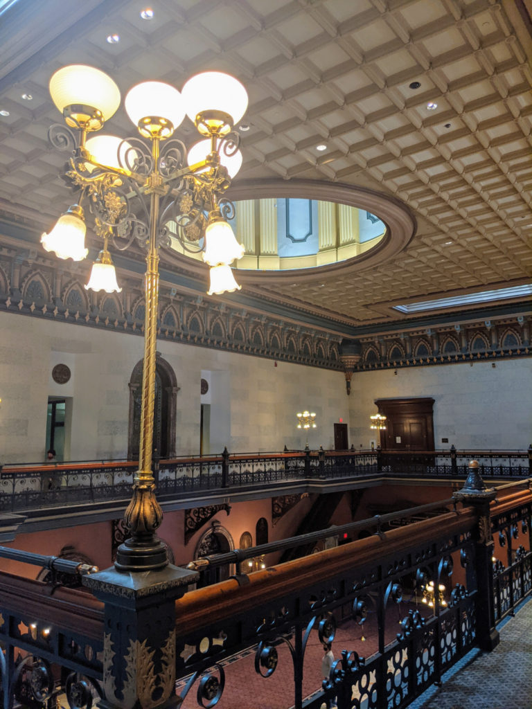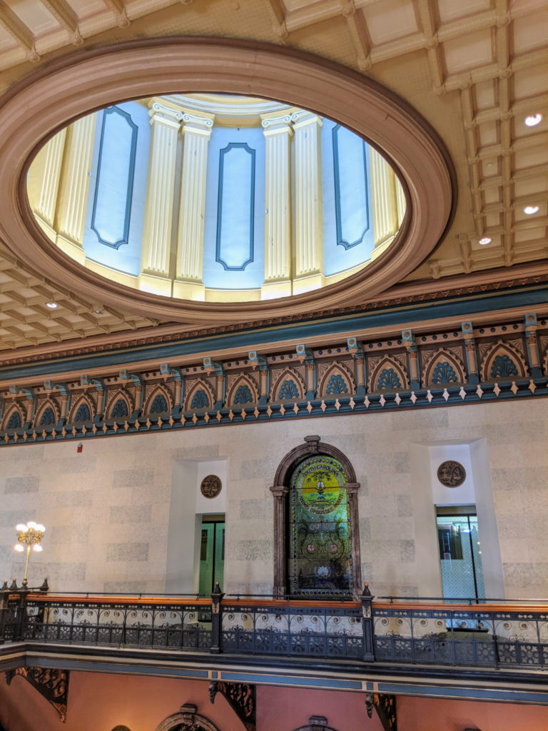 The hall is floored in beautiful pink marble, apparently recently polished. The tour guide said they used to be uneven, but now they shine! The pillars are blue granite from South Carolina. At the far end are more bathrooms, and on either side are offices – I think one side is the Governor’s.