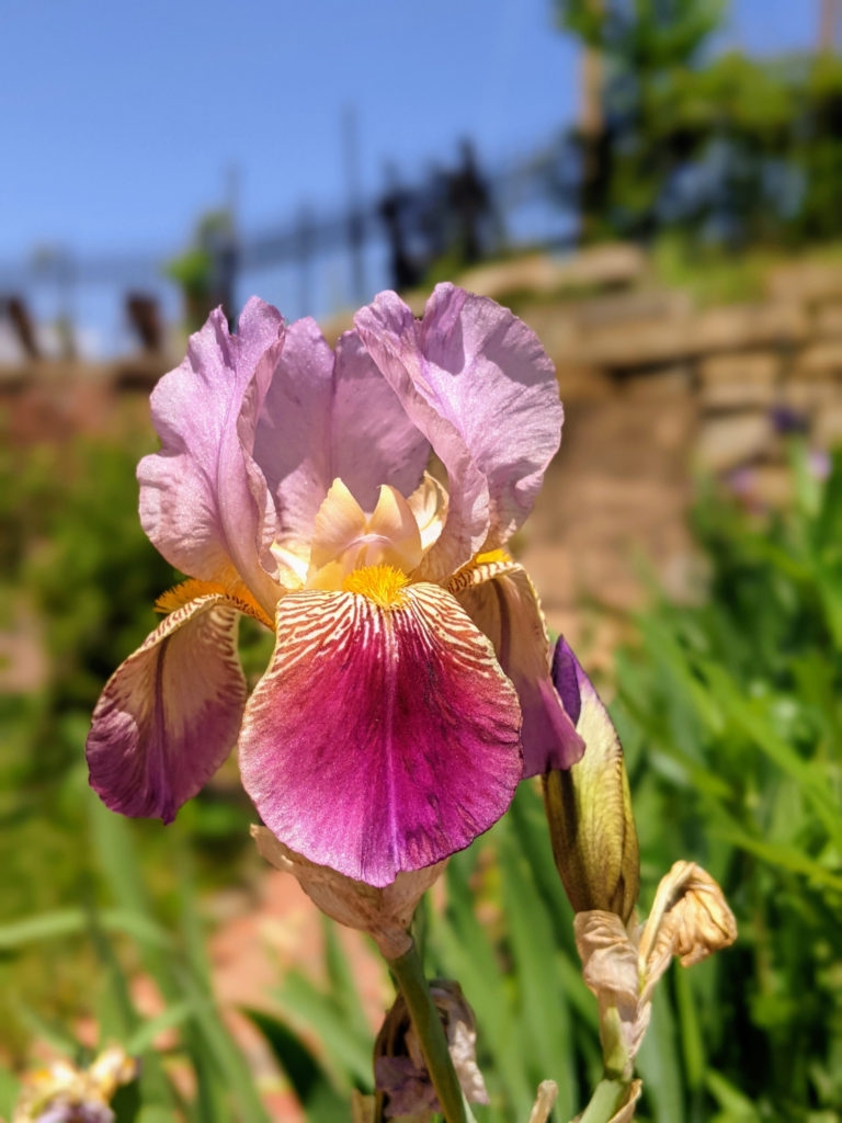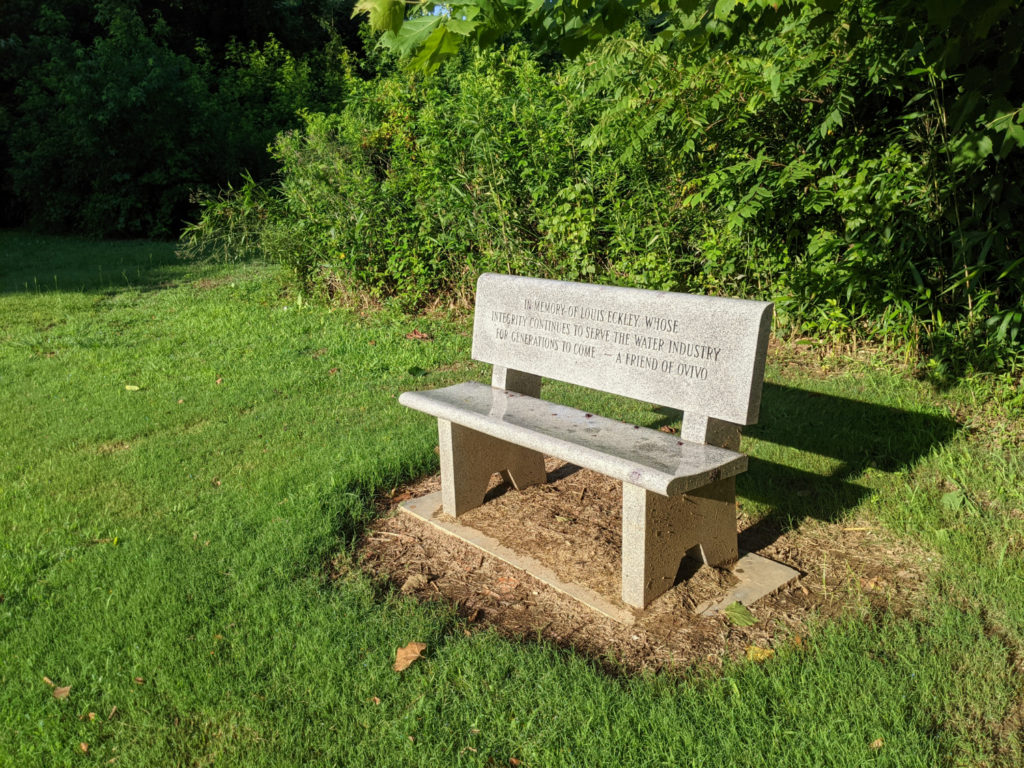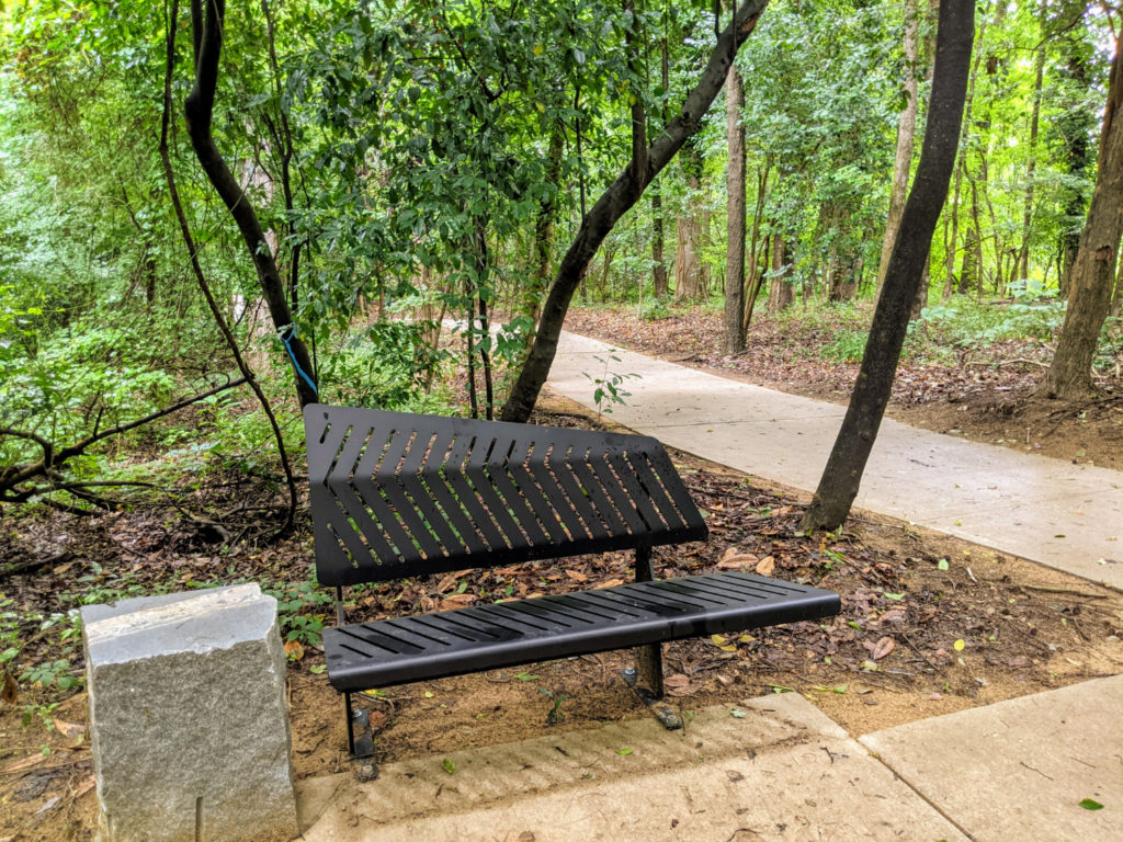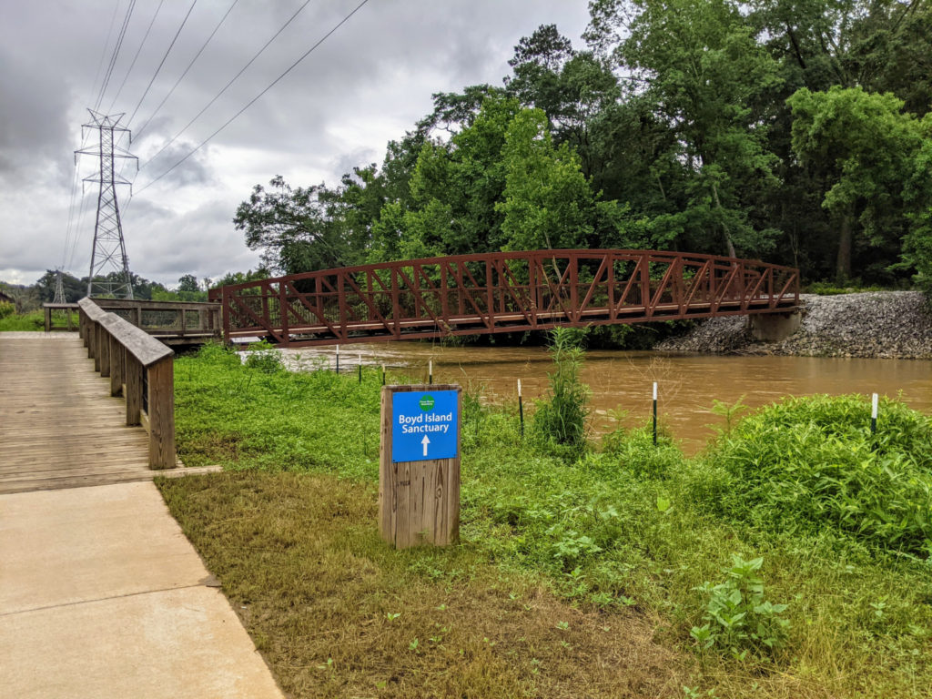 From here, you can turn left towards a boardwalk, the zoo, and ending in a loop on Boyd Island Sanctuary, which has unique seating and picnic tables. You can’t enter the zoo from this path – a chainlink fence separates it. But you pass under the bridge between the zoo and the botanical gardens, and you can hear carousel music tinkling from across the river. It’s not paved all the way to the island, either – there’s a section still to be done, and it can be a little muddy here. But the path is wide and easy enough to traverse. The island is pretty cool – there are benches, picnic tables, and garbage cans, all in a particular modernist granite-block design.
