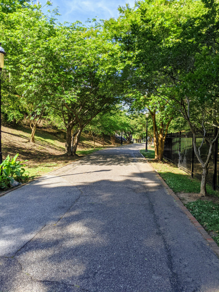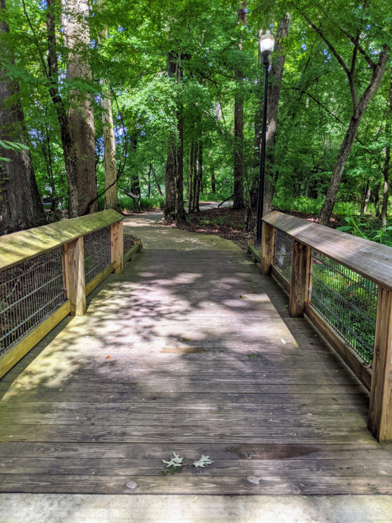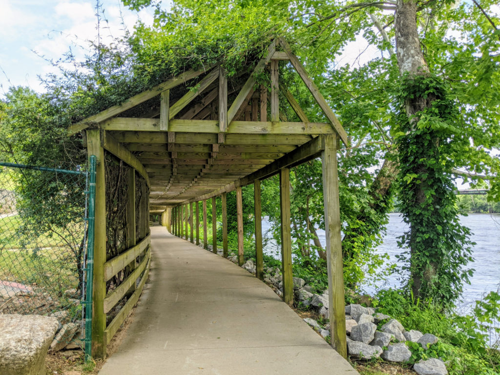 The West Columbia portion is very scenic, with pretty low-lying areas which get misty in the mornings. There’s a boardwalk under the Gervais Street Bridge and several more along the way. Some are like covered bridges that go under the railroad tracks. A portion near the amphitheater features some beautiful houses to look at while you’re walking. It’s winding and interesting with lots of benches and picnic tables. And there’s a larger, two-table pavilion near the Cayce Riverwalk Picnic Shelter (the one on Naples Street.)